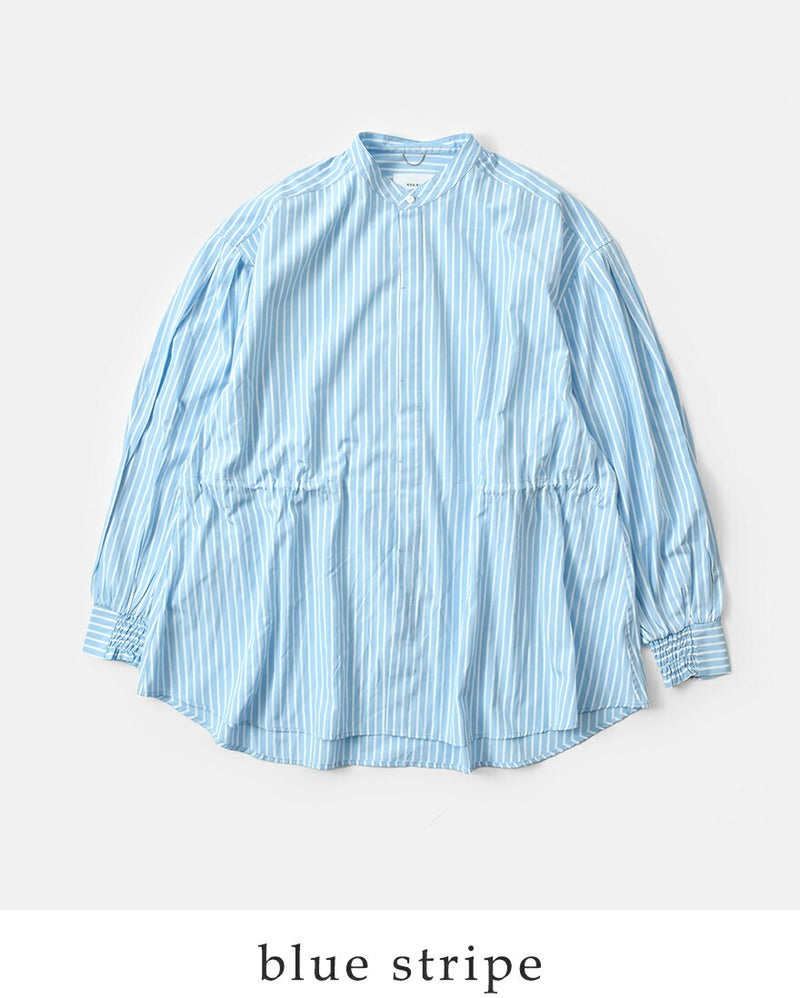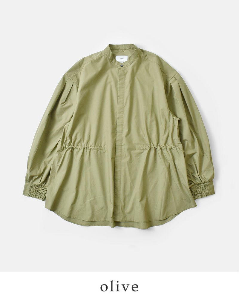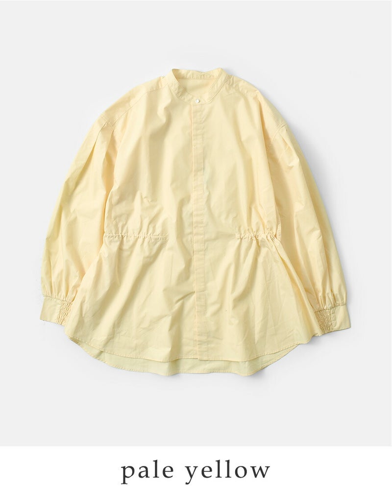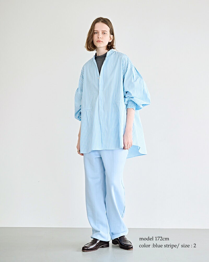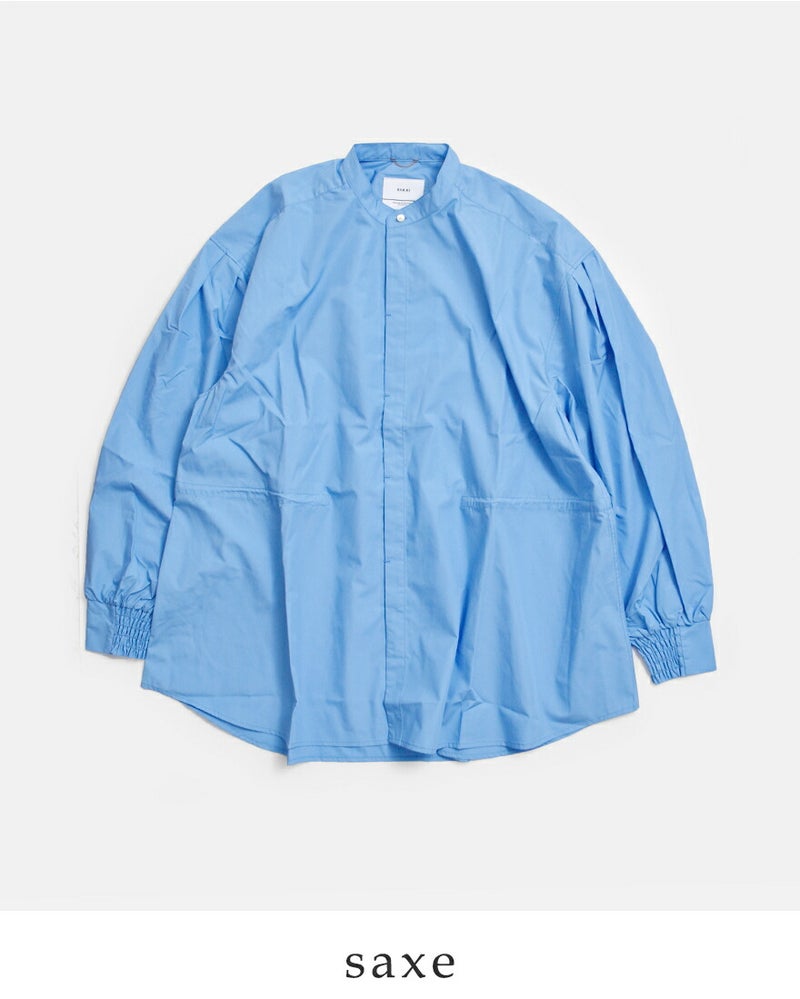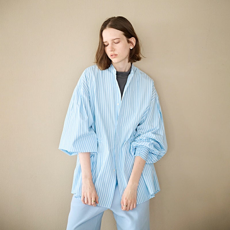 ボリューム感のある袖とワイド、シルエットが特徴的なバンドカラーシャツ