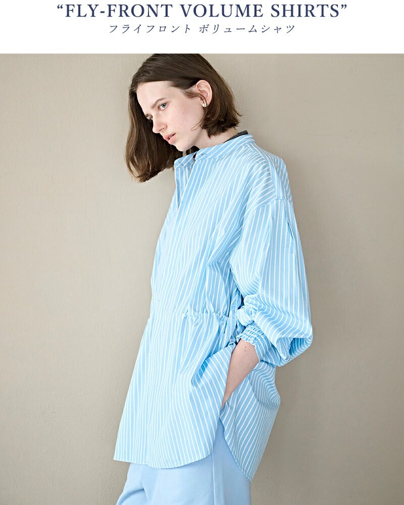 kha:ki(カーキ)より、フライフロントバンドカラーボリュームスリーブシャツのご紹介です。ボリューム感のある袖とゆったりとしたシルエットが特徴的なバンドカラーシャツです。ウエスト内側のスピンドルでシルエットのアレンジをお楽しみいただけます。ギャザーをたっぷりと入れた袖口はシャーリング仕様で、袖まくりでボリューム感を演出出来ます。
