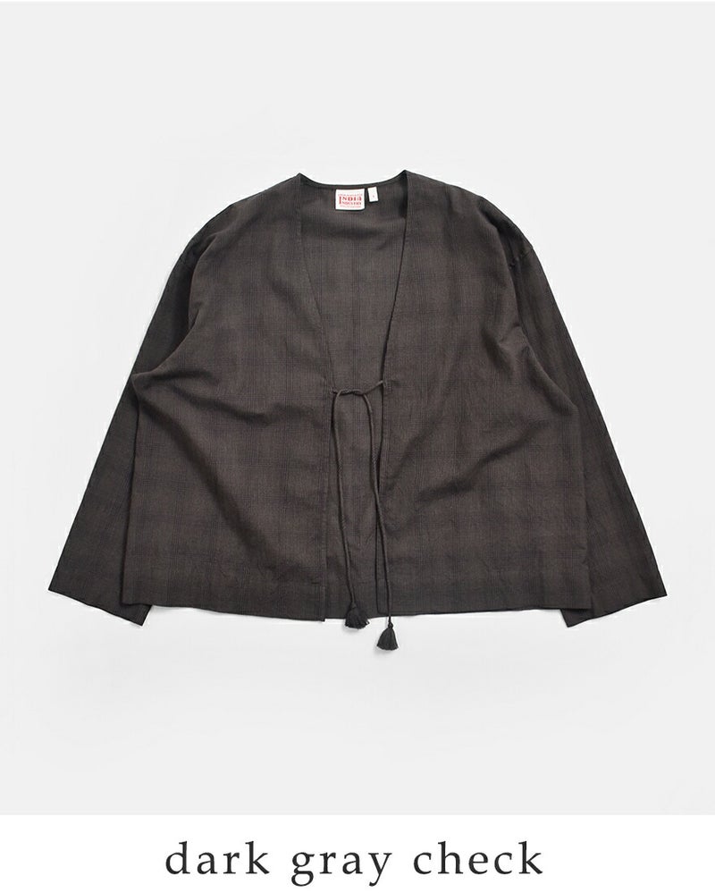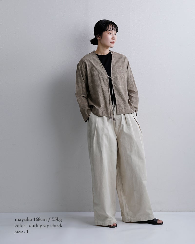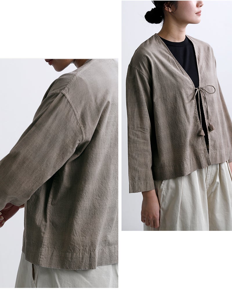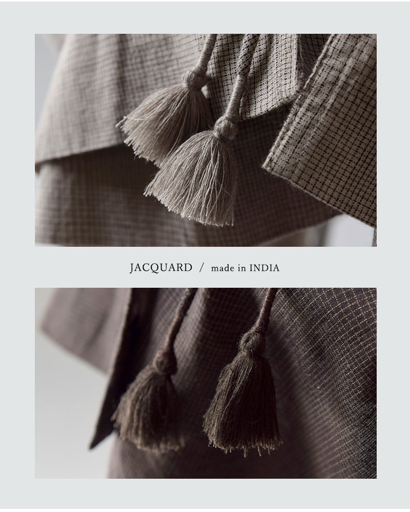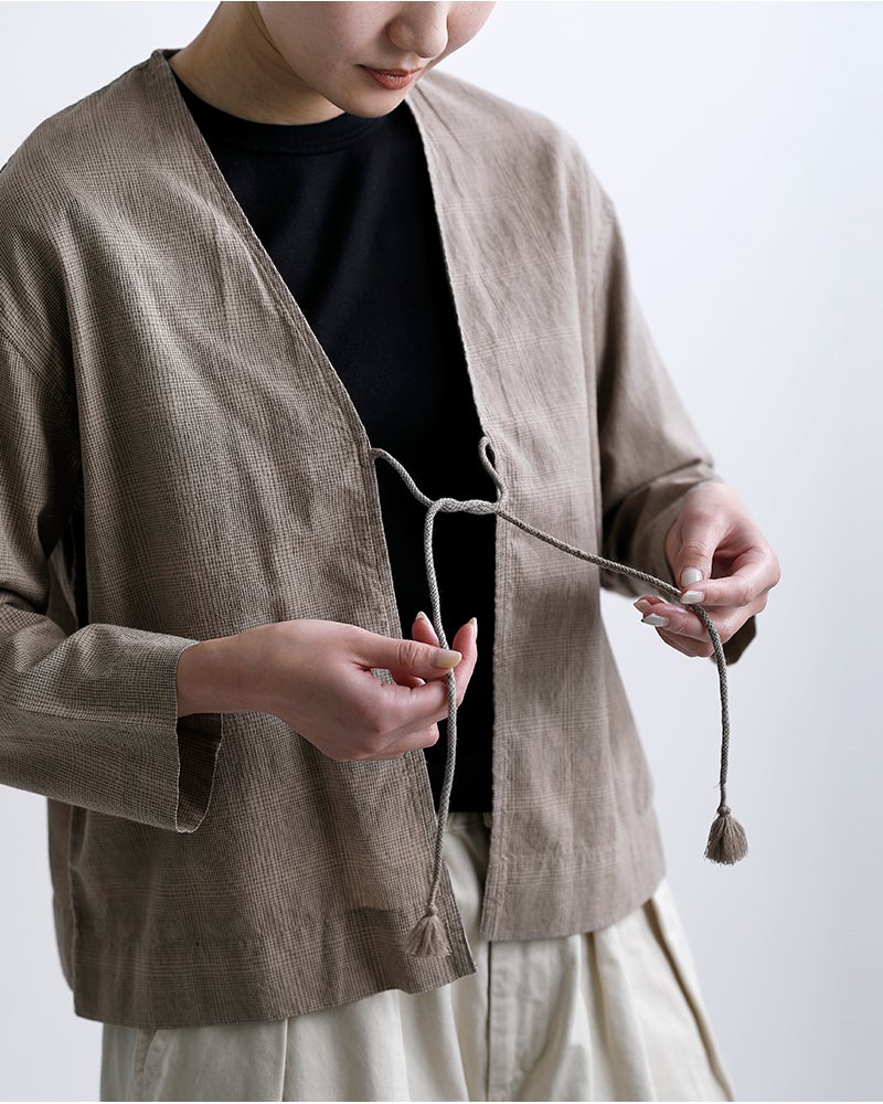 ボタンではなく紐で留める仕様。結び方や垂らし方でアレンジが楽しめ、紐先のフリンジがさりげないアクセントを添えます。抜け感のある着こなしを演出するディテールです。