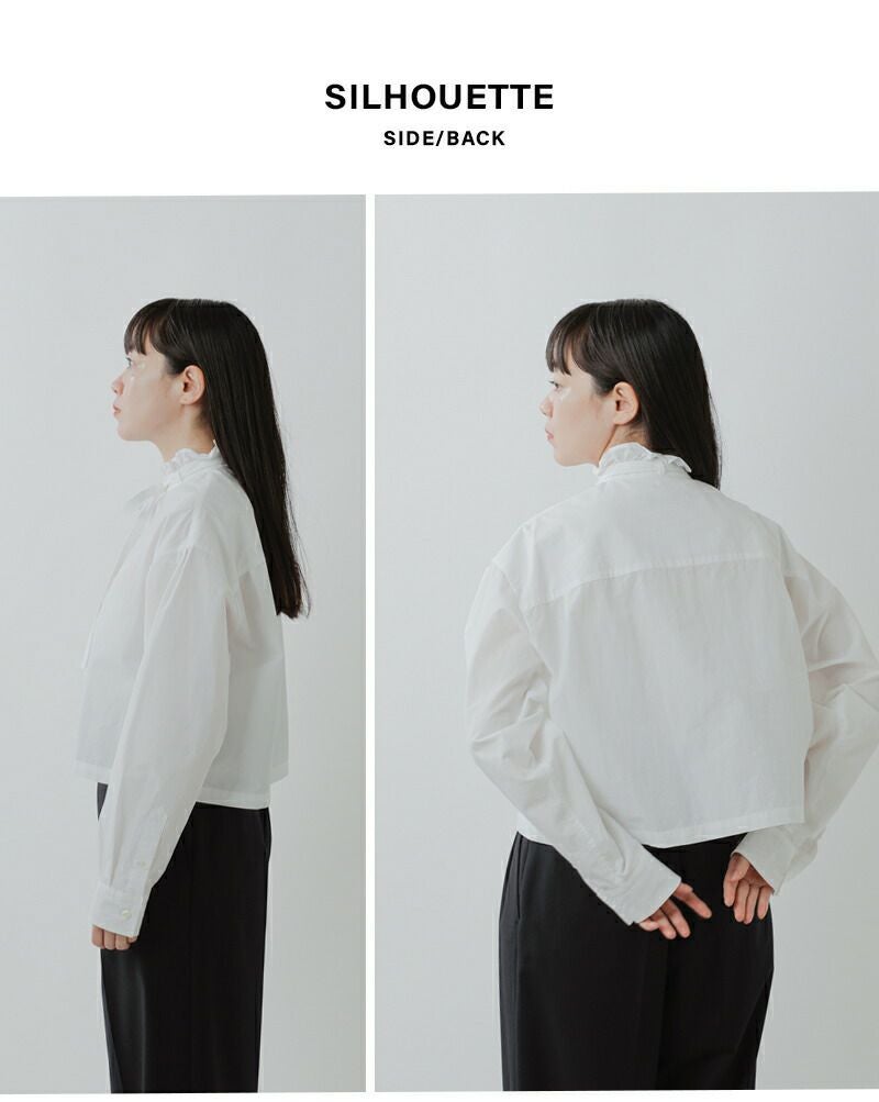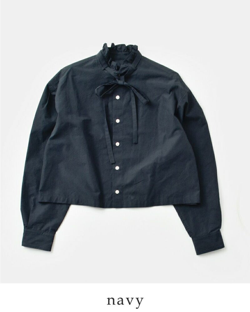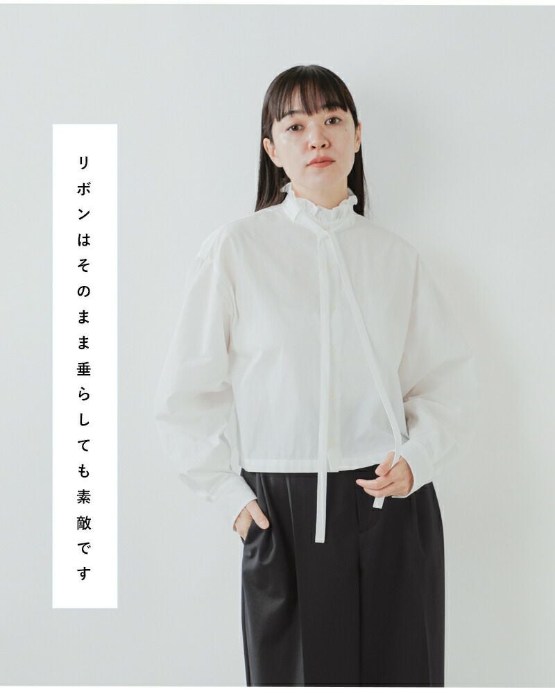 スタンドカラーに控えめなフリルを施し、シンプルな中にもフェミニンさをプラス。前衿のリボンデザインが上品で清楚なイメージを演出します。リボンは取り外し可能でシンプルなスタイリングにもgood!