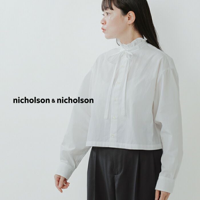 nicholson&nicholson(ニコルソンアンドニコルソン)より、ウォッシュドコットンフリルカラータイブラウスのご紹介です。上品なフリルネックとリボンデザインがアクセントになった、クラシカルなブラウス。トレンド感のあるクロップド丈でハイウエストボトムとの相性が抜群♪ボリューミーなボトムスともバランスよく合わせられます。大人可愛さを演出する、上質な一枚です。