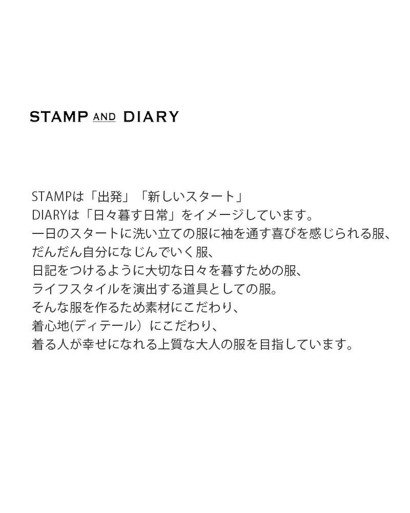 STAMPは「出発」「新しいスタート」 DIARYは「日々暮す日常」をイメージしています。 一日のスタートに洗い立ての服に袖を通す喜びを感じられる服、 だんだん自分になじんでいく服、 日記をつけるように大切な日々を暮すための服、 ライフスタイルを演出する道具としての服。 そんな服を作るため素材にこだわり、着心地(ディテール)にこだわり、 着る人が幸せになれる上質な大人の服を目指しています。