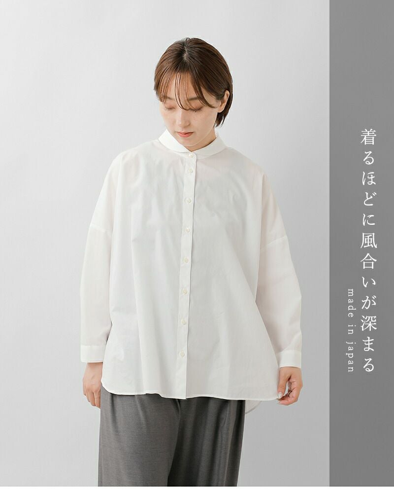 糸質の良さを感じられる自然なつやときれいめな表情が特徴的です。洗うごとに程よいナチュラルなシワが生まれ、着るほどに風合いが楽しめます。