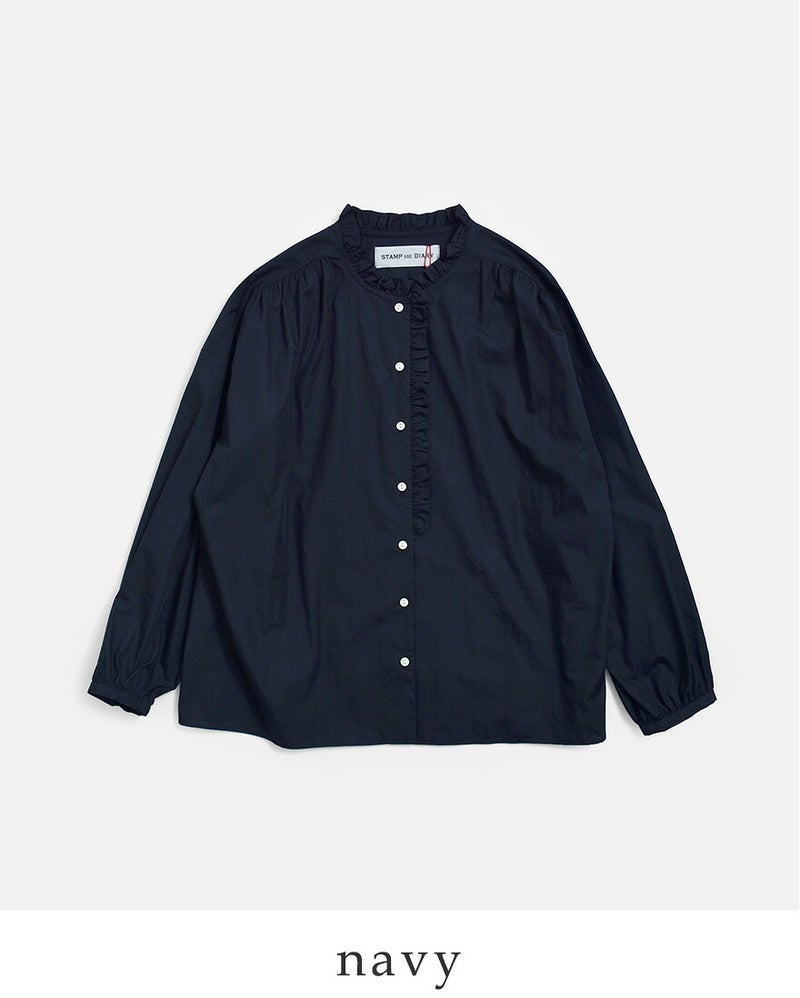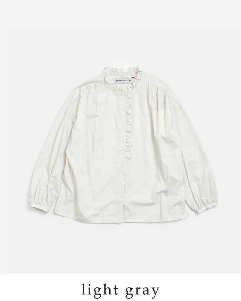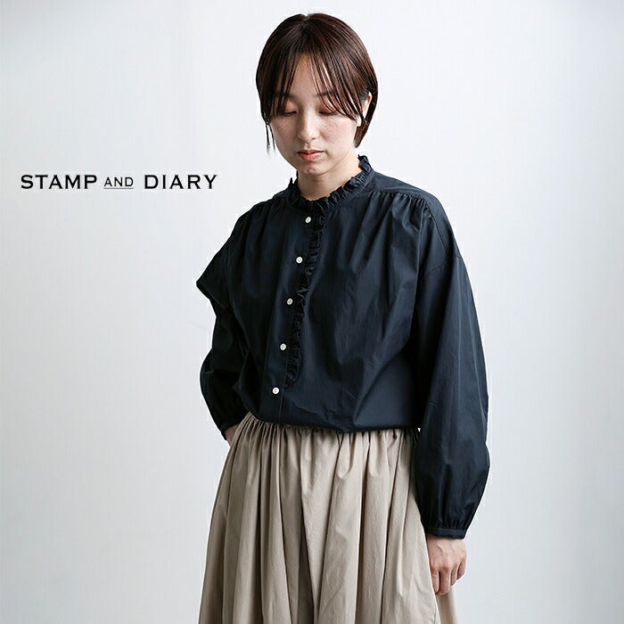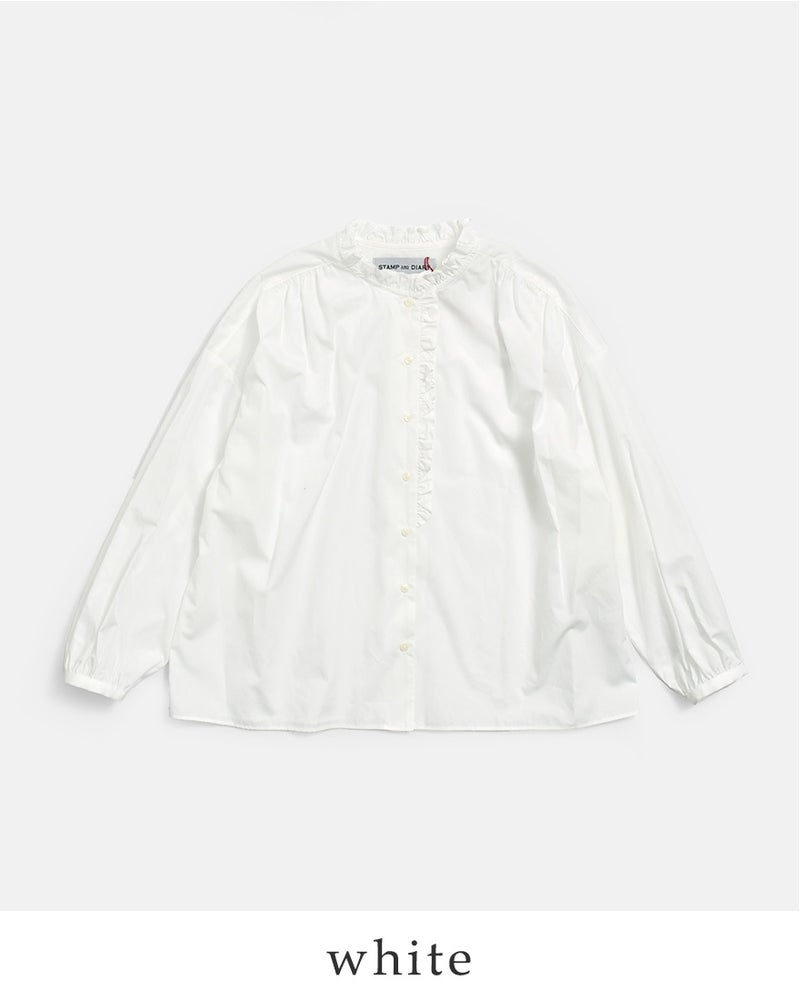 STAMP AND DIARY(スタンプアンドダイアリー)より、コットン ノーカラー フリル ブラウスのご紹介です。襟・フロントにフリルがあしらわれたさり気ない甘さをプラスするブラウス。サラリと心地よい薄手のコットンブロードを使用。一枚で存在感と華やかさがあり、薄手の素材なので重ね着やタックインもきれいにまとまります。カジュアルにも、フォーマルなスタイルにも重宝します。