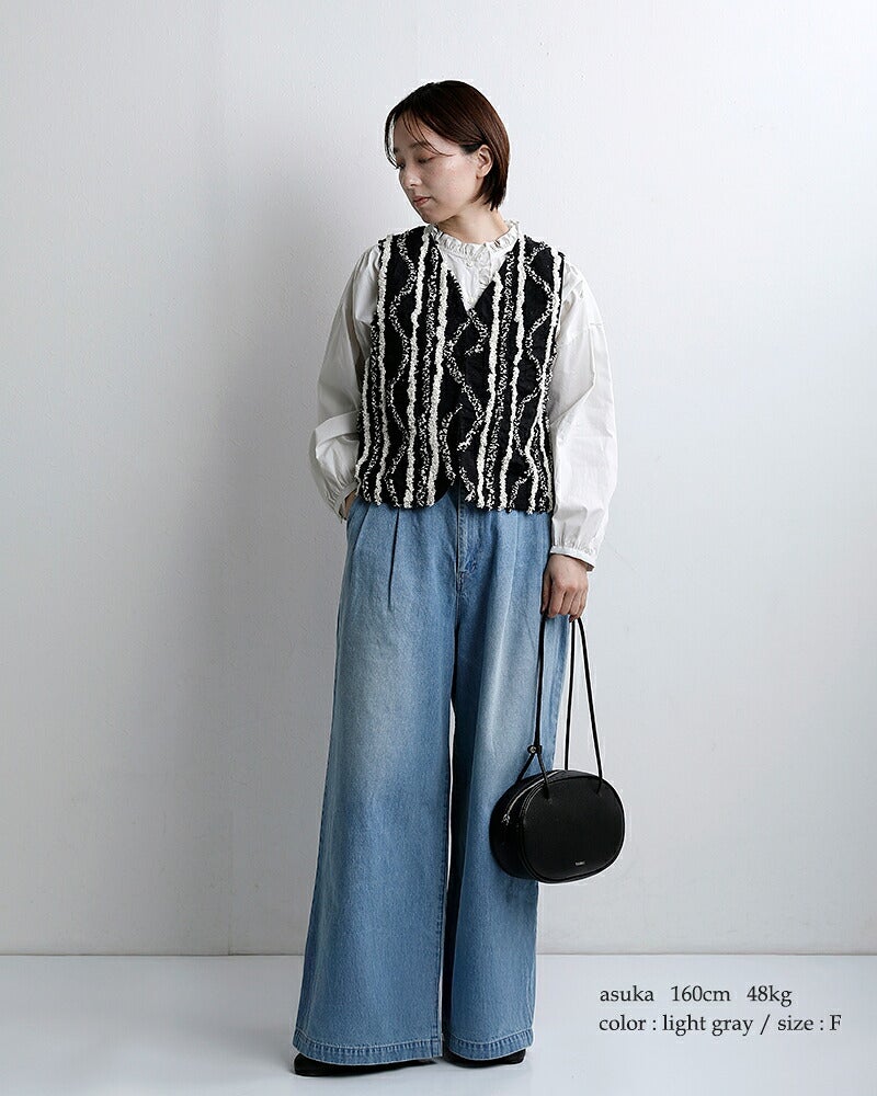 フリル付きの襟はそのままフロントの合わせ部分に繋がり、華やかな印象に。