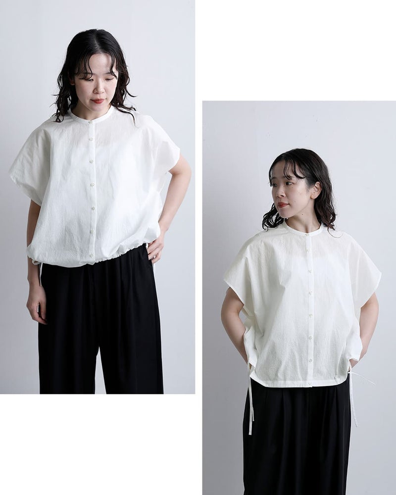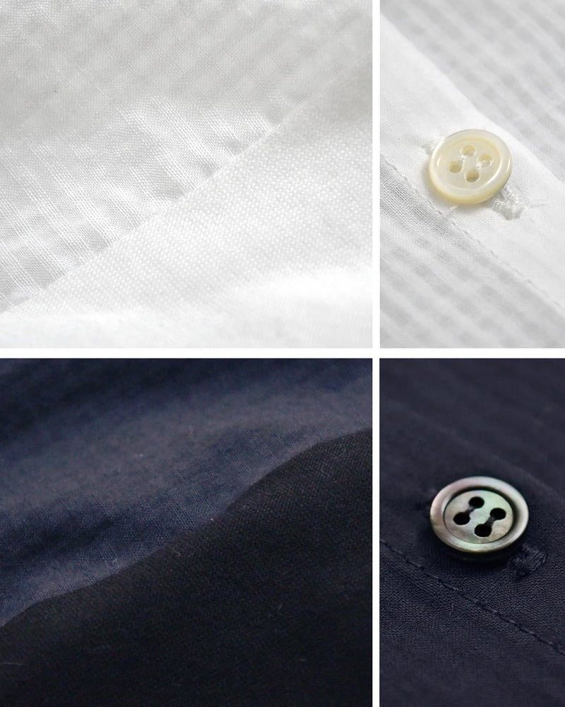 浜松で織り上げられたジャガードギンガムチェック生地を使用。繊細な織りで表現されたチェック柄は、奥行きのある表情とほんのりとした透け感が魅力です。しなやかで軽やかな風合いが、季節感のある涼やかな着こなしを叶えます。
