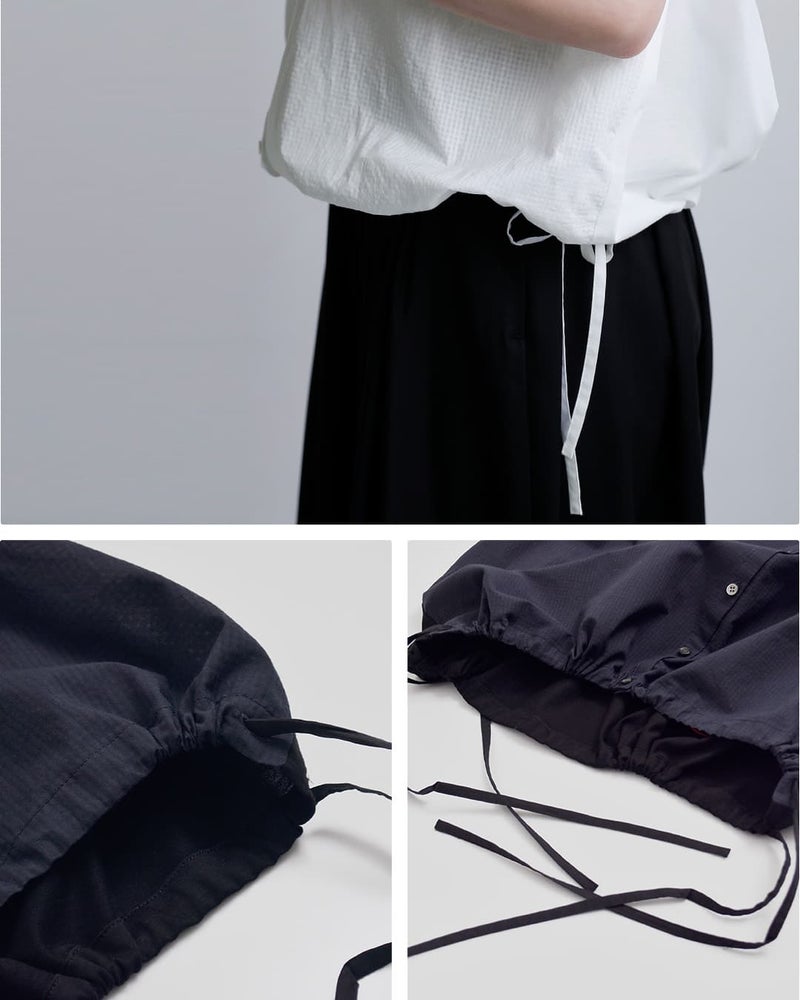 裾にはコードを施し、シルエットのアレンジも可能。きゅっと絞って丸みのあるフォルムにしたり、そのままラフに着こなしたりと、スタイリングに合わせて変化を楽しめます。
