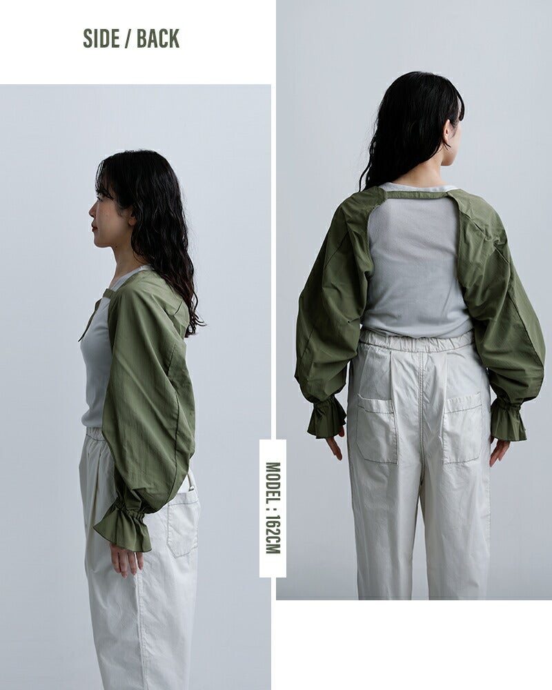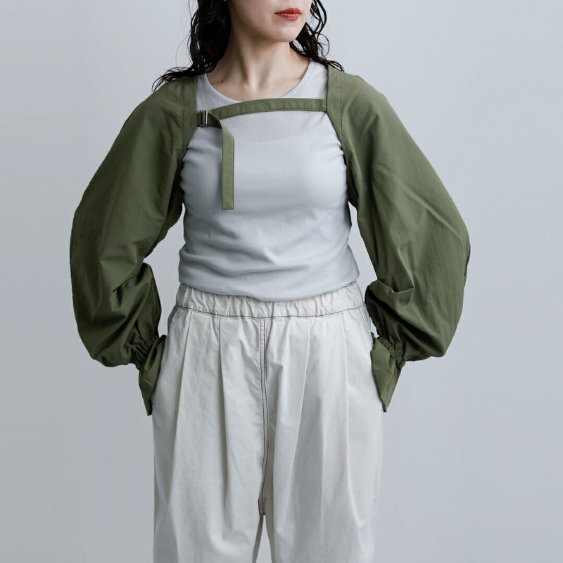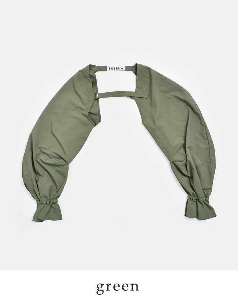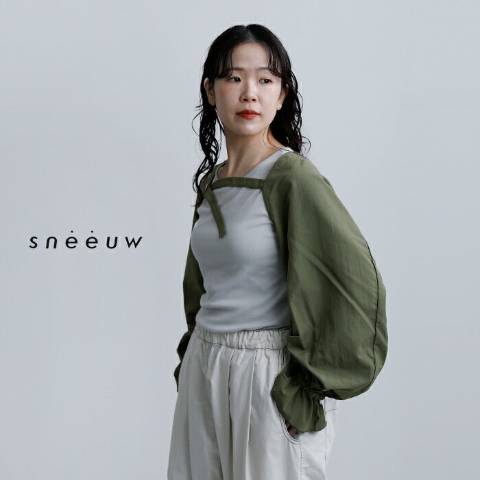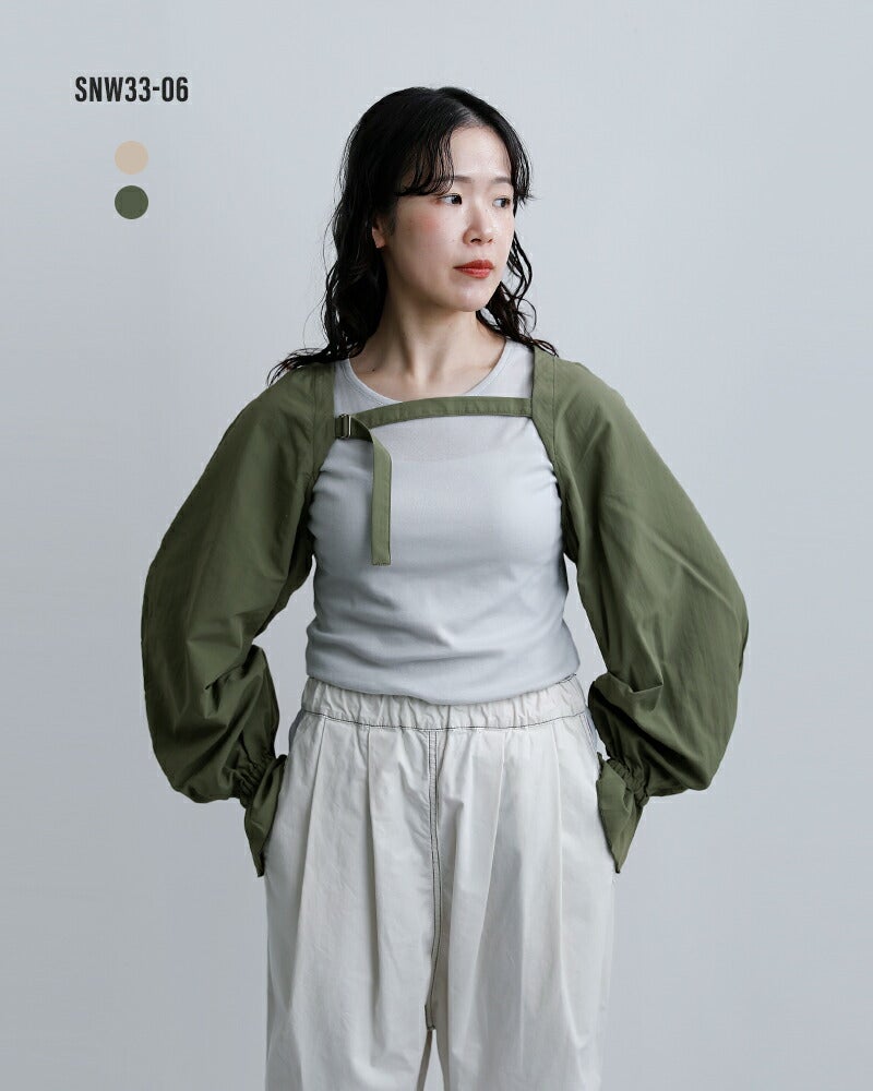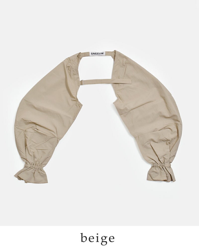 sneeuw(スニュウ)より、アームスリーブのご紹介です。袖だけのユニークなデザインで、いつものスタイリングに新鮮なアクセントを加えてくれる一枚。たっぷりとしたボリュームシルエットに、袖口のギャザーがやわらかな表情を演出し、さりげなく気分を高めてくれます。Tシャツやカットソー、ワンピースなどに重ねるだけで、コーディネートの印象をぐっと変えてくれるアイテムです。素材には、ワッシャー加工を施したコットンタッチの薄手ナイロンウェザーを使用。ほどよくラフな風合いで甘さを中和し、デイリーに取り入れやすいバランスに仕上げられています。