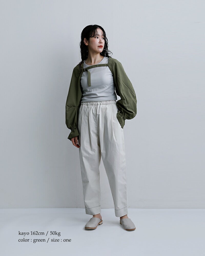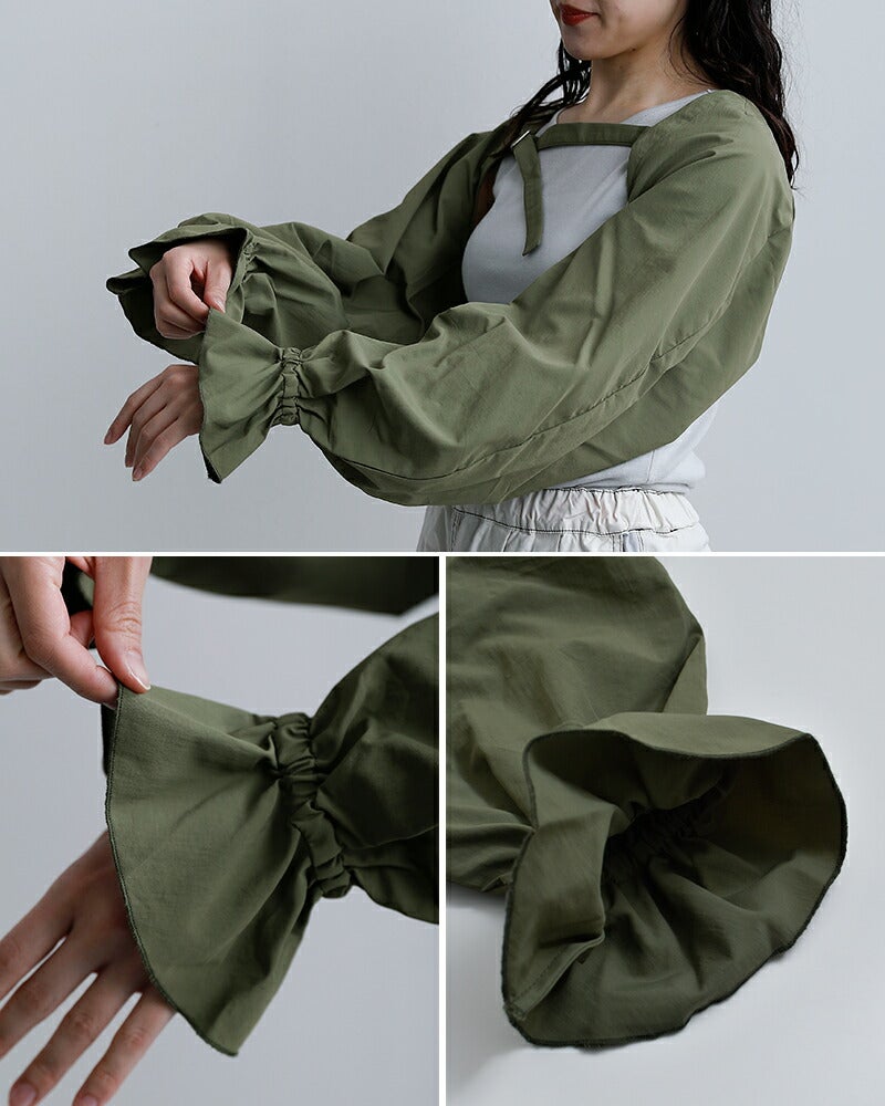 袖口にはたっぷりとギャザーを施し、ふんわりと広がるボリューム感のあるシルエットに仕上げられています。動きに合わせて揺れる軽やかな表情が、コーディネートにやわらかなニュアンスをプラス。