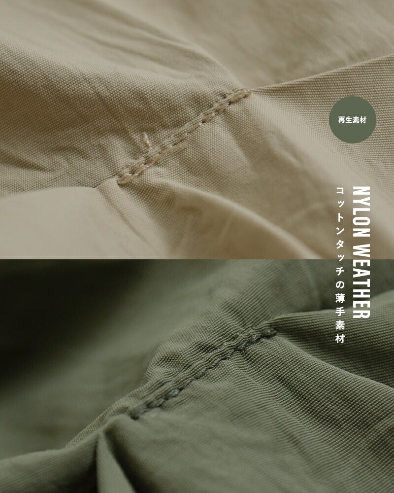 ワッシャー加工を施した、コットンタッチのナイロンウェザー素材を使用。軽やかでさらりとした肌触りに加え、通気性にも優れており、暑い季節でも快適に着用いただけます。繊維廃棄物から再生された素材を使用し、環境にも配慮された一着です。
