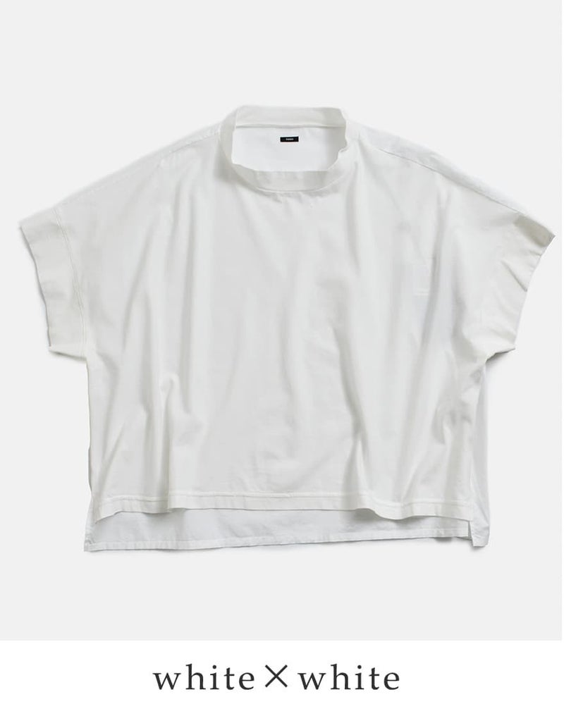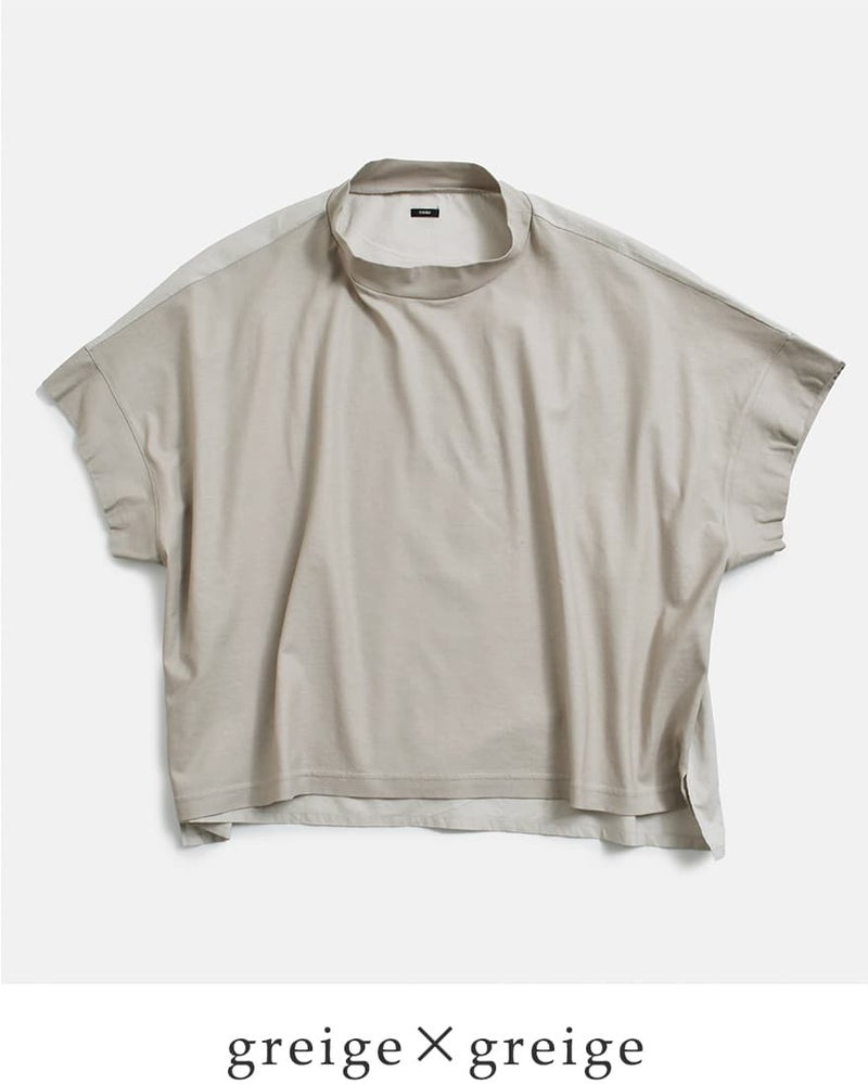 フロントに、接触冷感と、汗染み軽減機能を持つマルチエフェクト強撚天竺を使用。バックはさらりとした上質なタイプライターを使用し、前後で異なる異素材デザインが洗練された大人のトップスに仕上がっています。