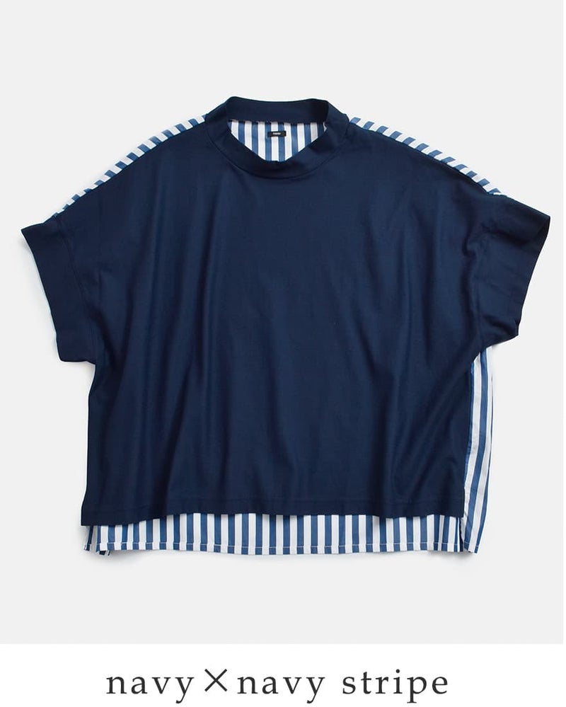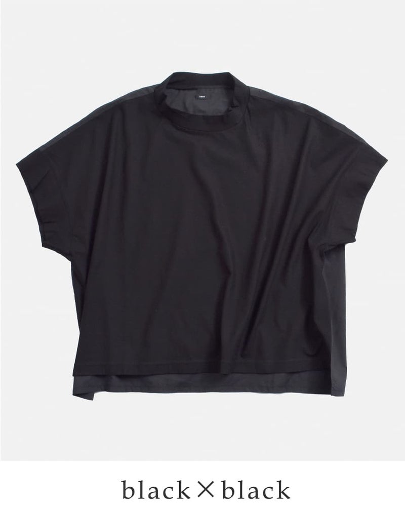 フロントは、伸縮性のあるカットソー素材、バックは上質感のある布帛(ふはく)素材を使用。この切り替えにより、Tシャツの手軽さがありながら、ブラウスのようなきちんと感も演出できます。