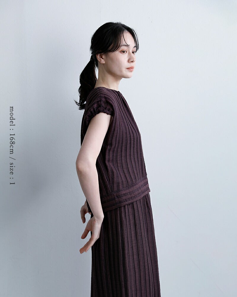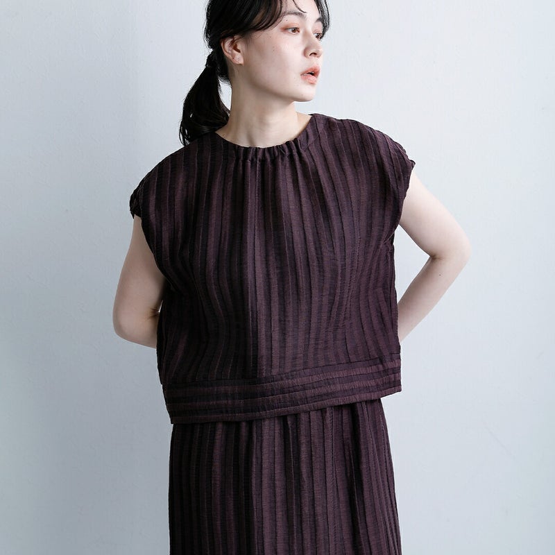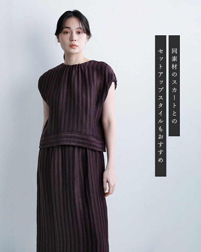 ストライプ状の凸凹したさりげない立体感を併せ持った素材。軽くてハリ感があり、風通しも良いので夏でも着用しやすいアイテムです。