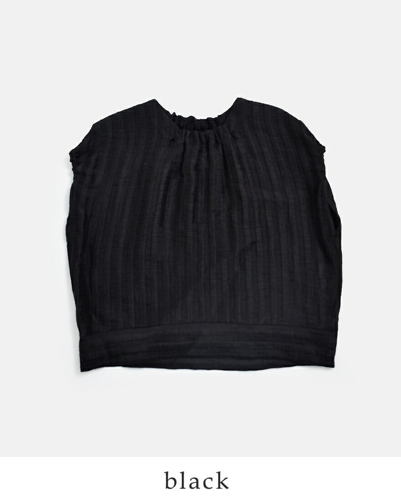 衿、袖の一部分にギャザーゴムディティールを施し、立体感と女性らしさのある雰囲気を演出します。裾は身頃と生地の方向を変えて、動きのある印象に。