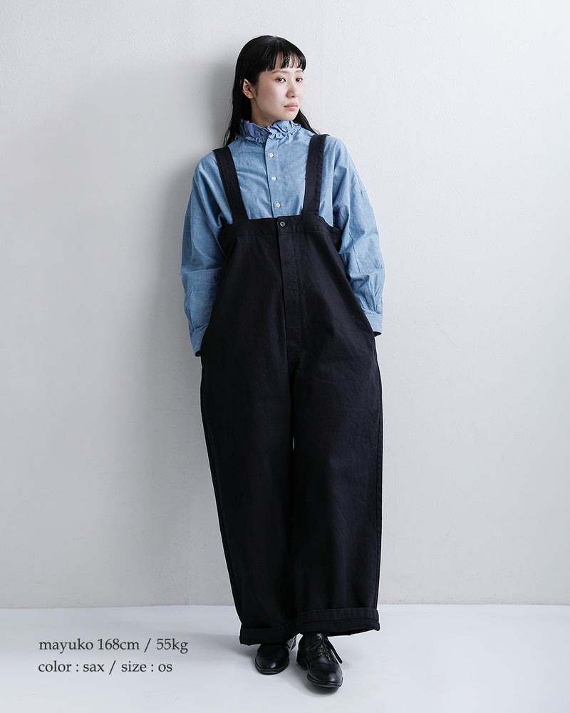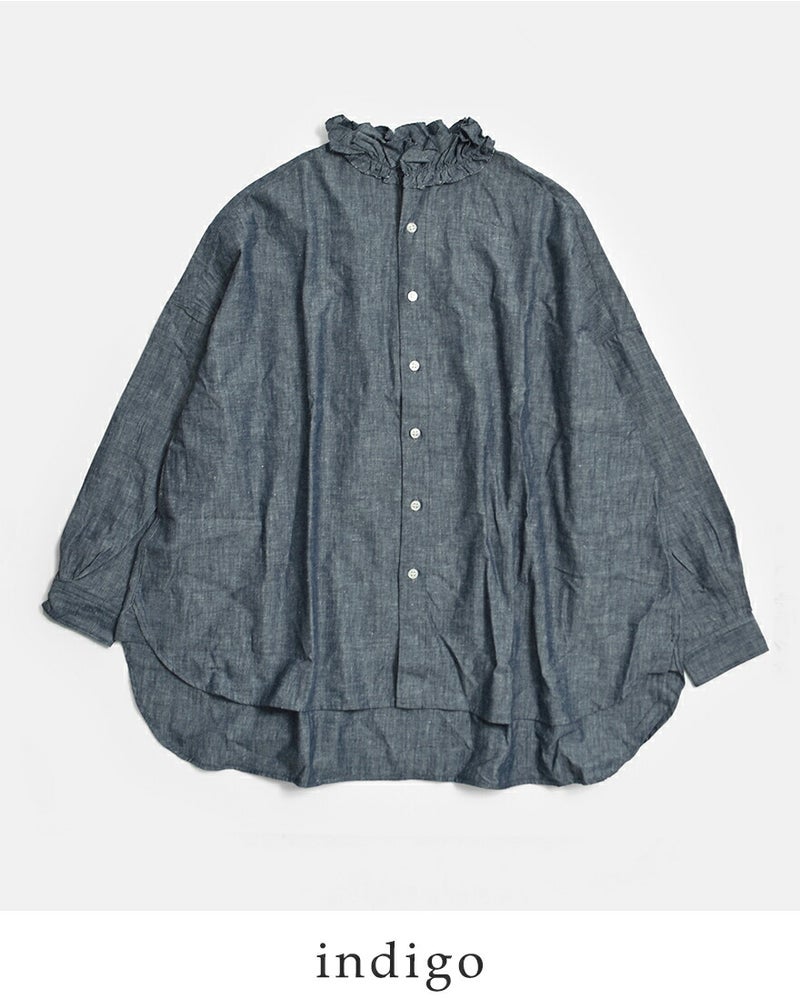 Yarmo(ヤーモ)より、コットンフリルシャツのご紹介です。ナチュラルな風合いと程よいハリ感が特徴の綿麻のシャンブレー素材を使用したフリル襟シャツ。首元のフリルがさり気なくフェミニンな雰囲気に仕上げてくれます。一枚ではもちろん、カジュアルに羽織ってもタックインにもちょうど良い着丈の万能アイテム。