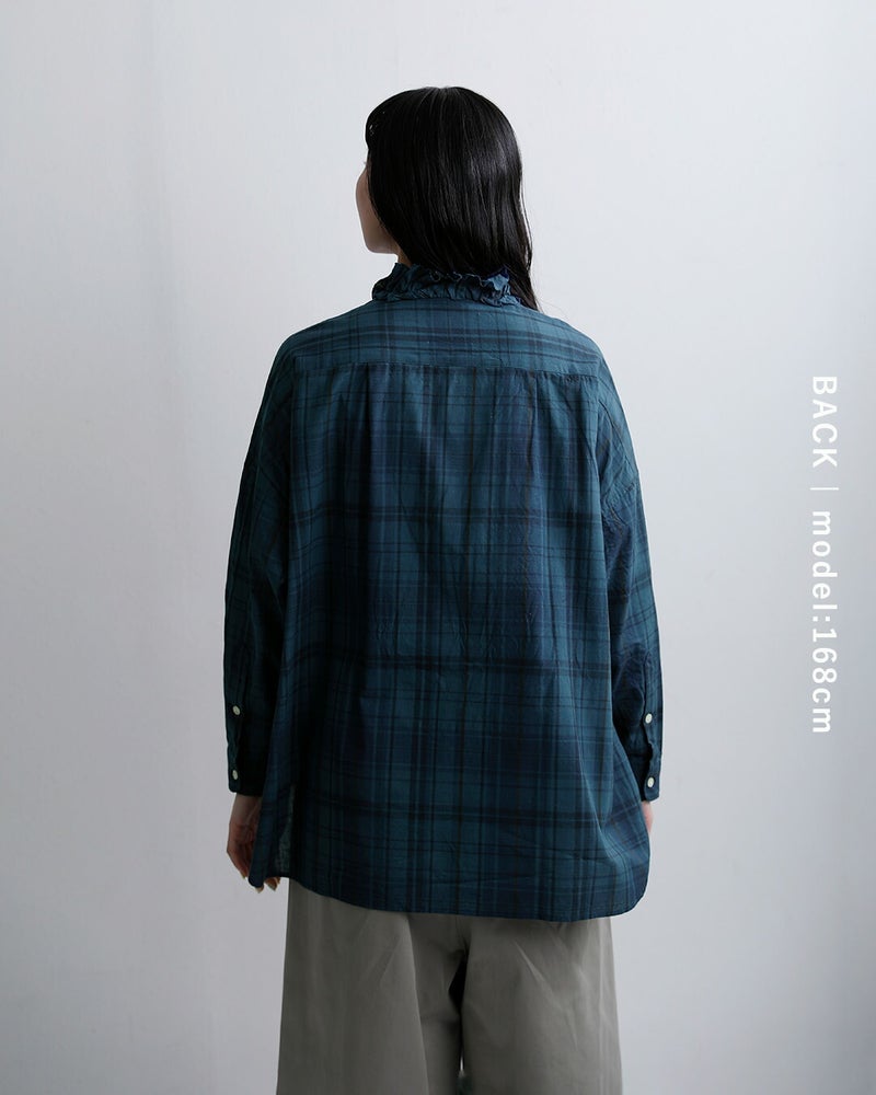 立ち上がったフリル付きの襟が女性らしい印象を添えます。1番上までシャツのボタンが付いておらず着用した時に窮屈に感じません。