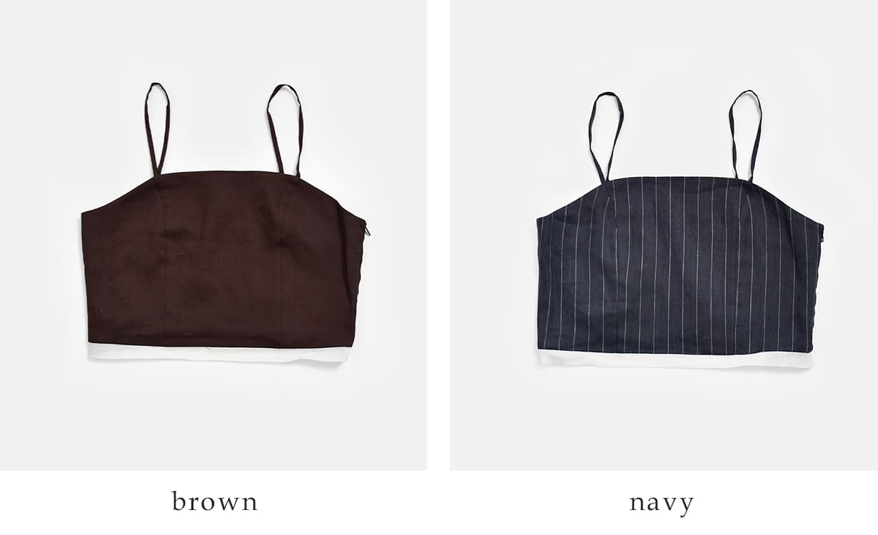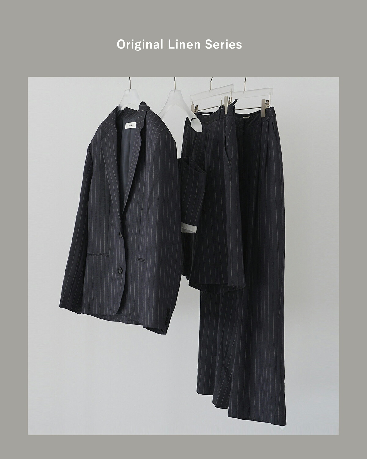 オリジナルで織り上げた薄手のリネン素材を使用。軽やかで通気性を感じられる質感が特徴です。無地ブラウンとストライプネイビーの2色展開。