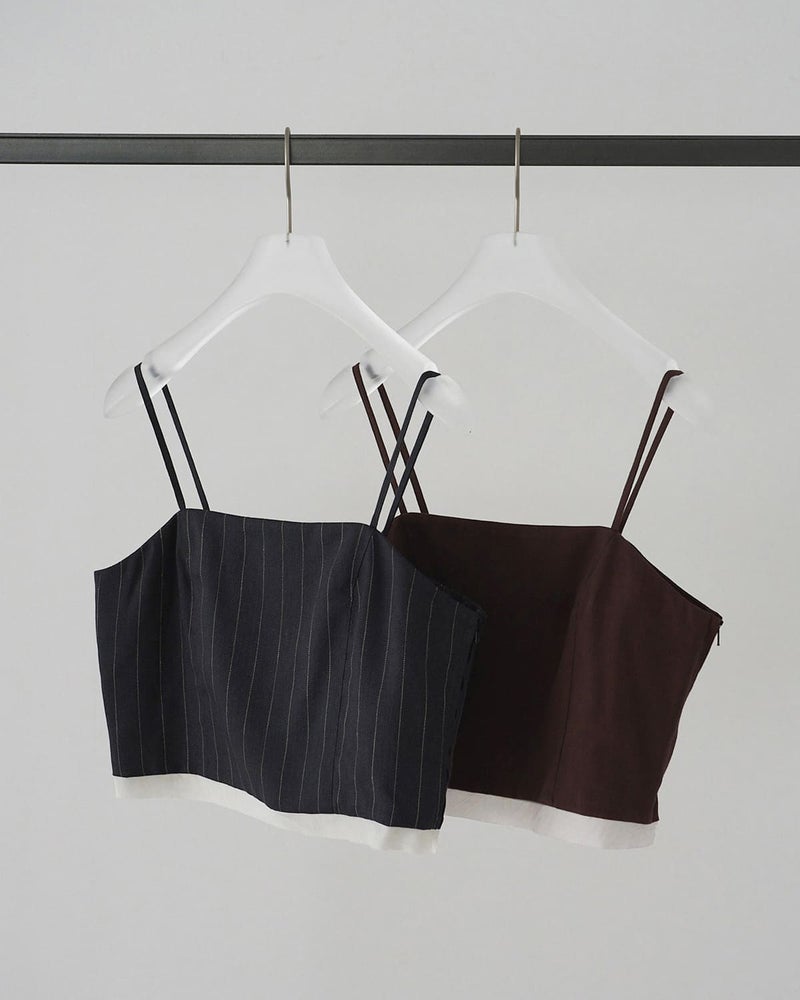 無地のブラウンとストライプ柄のネイビーの2色展開で、スタイリングに合わせて選べるのも魅力。裾に施された別布使いがさりげないアクセントとなり、一枚で着用しても着映えするデザインに仕上げています。