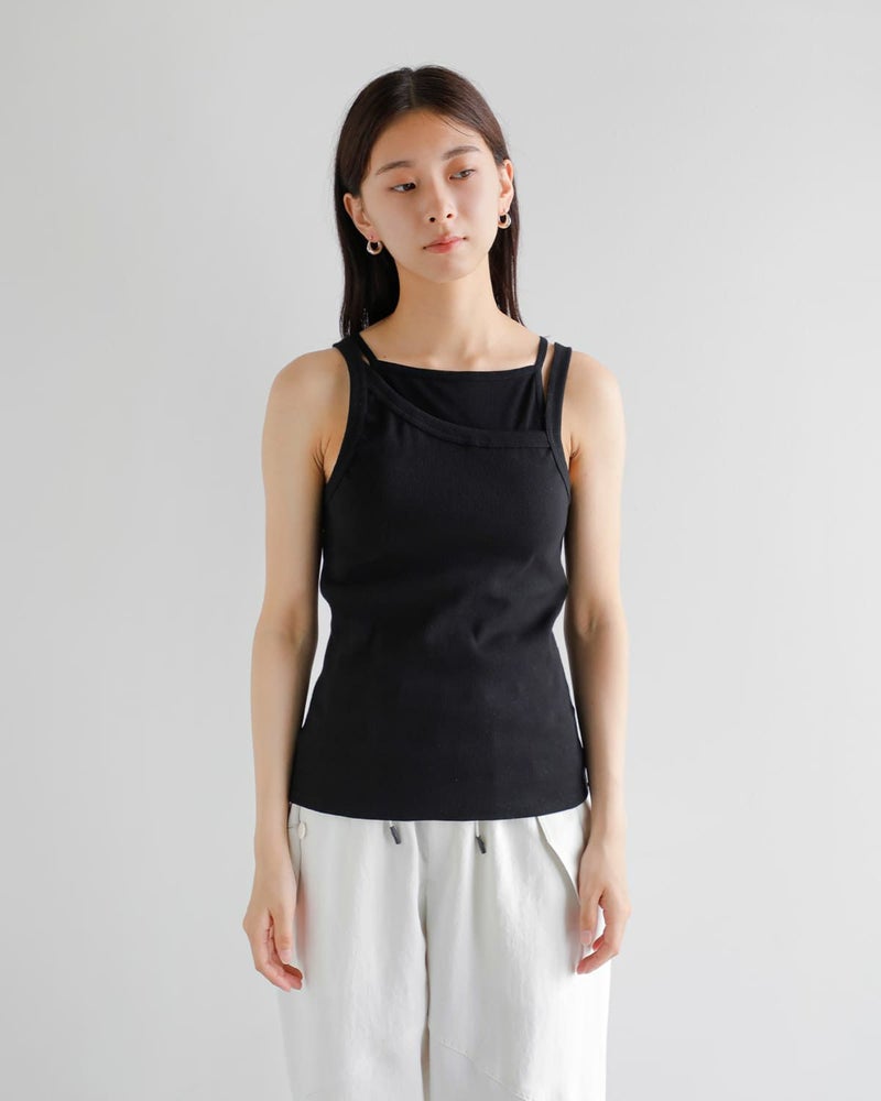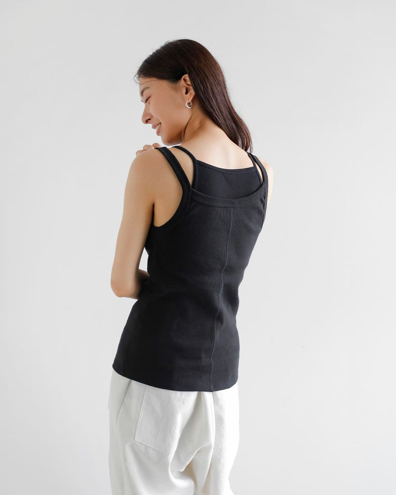 2枚が重なるようにデザインされたシアーキャミ風のレイヤード。視線を引きつけるポイントに。