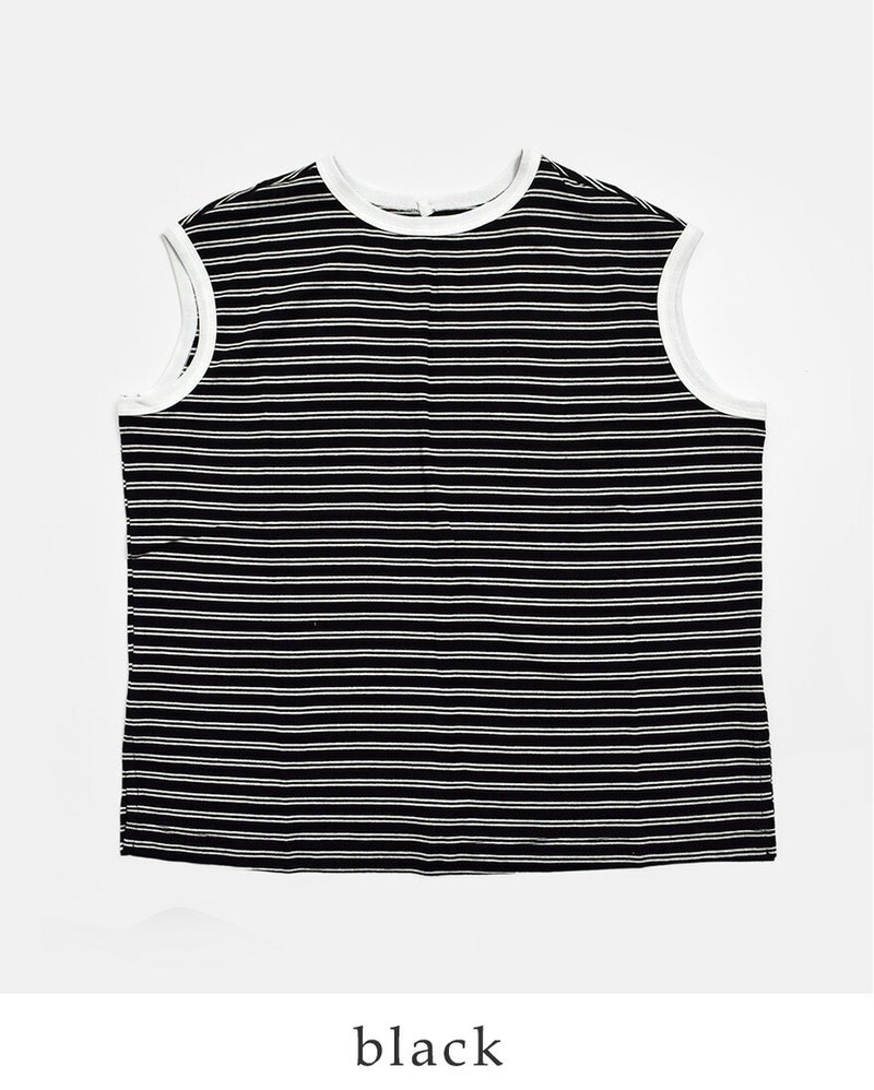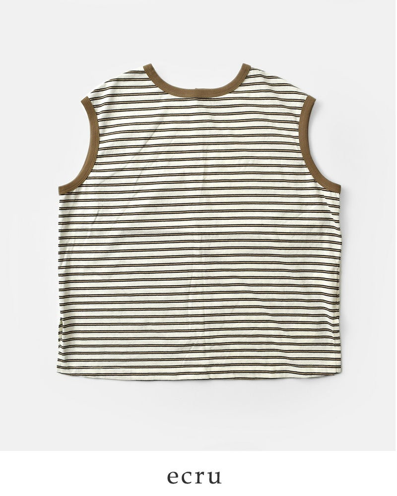 kha:ki(カーキ)より、コットンマルチボーダー 前後2way ノースリーブ カットソー “MULTI STRIPED SLEEVELESS TOP” をご紹介します。 レトロな配色が目を惹く、マルチボーダー素材を使用したノースリーブカットソー。 前後どちらを前にしても着用できる2wayデザインで、その日の気分やスタイリングに合わせて表情の変化を楽しめます。 両サイドには深めのスリットを施し、動きやすさと抜け感をプラス。 スリット部分にあしらったシェルボタンが、さりげないアクセントになっています。 一枚でもレイヤードでも活躍し、デイリーコーデに程よいレトロ感を添えてくれるアイテムです。
