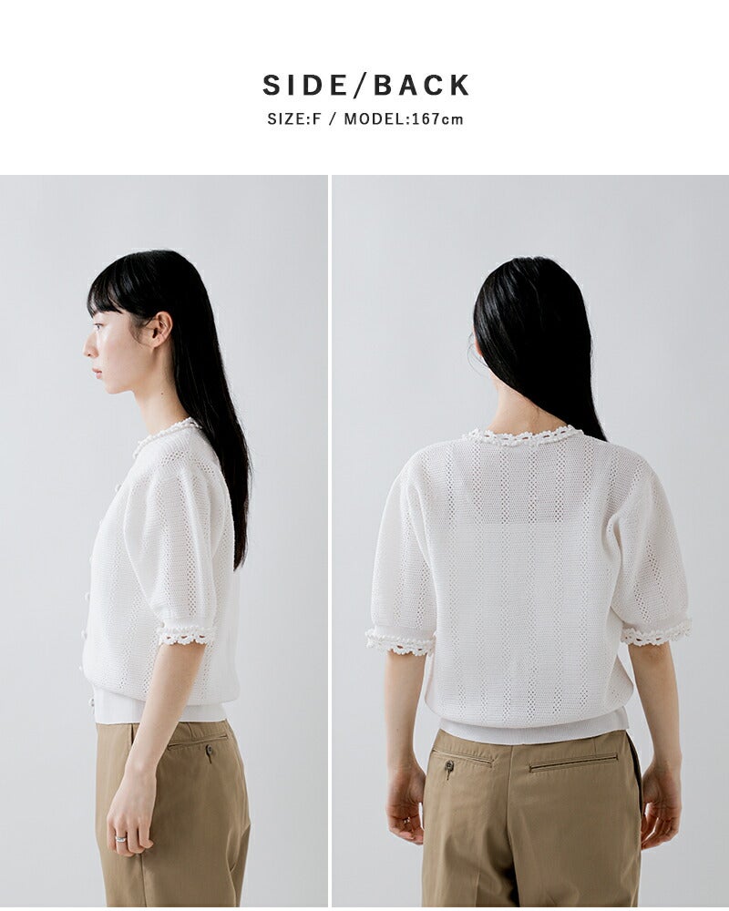 襟ぐりと袖口には、手編みのかぎ針モチーフレースをあしらい、さりげなく華やかさをプラス。ディテールまで丁寧に作り込まれたデザインが、大人の上品さを引き立てます。羽織としてはもちろん、ボタンを留めてトップス感覚で着用できる汎用性の高さも魅力。デイリーからきれいめなスタイリングまで幅広く活躍します。