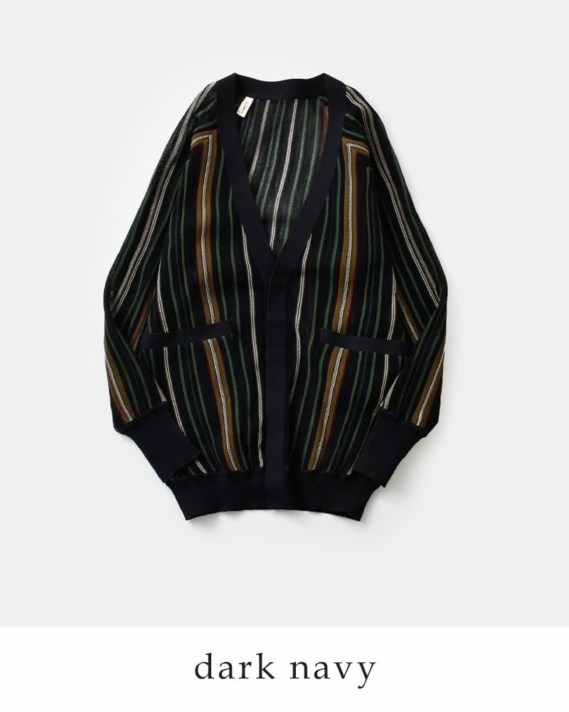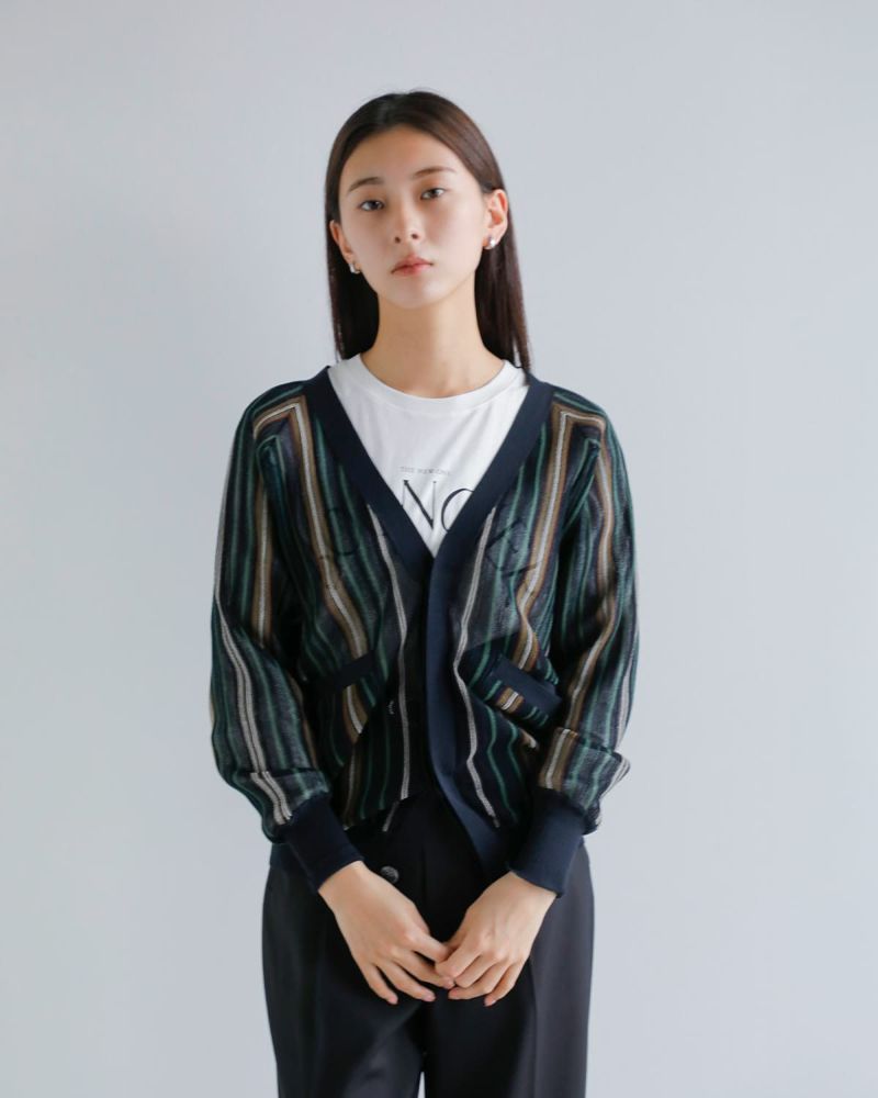 透け感のある素材にストライプ配色が映えるカーディガン。軽く伸縮性のある清涼感のある生地で、さっと羽織るだけでスタイルに軽さとリズムを与えてくれます。フロントには光沢のある4つのボタンを比翼仕様で配し、ミニマルで洗練された印象に仕上げています。ボタンを閉じればVネックとしてすっきりと着こなせ、開けて羽織れば抜け感のあるスタイルに。袖口と裾にはリブを配しており、全体に自然なメリハリをプラス。フロントにはポケットも備えられ、使い勝手の良い一枚です。