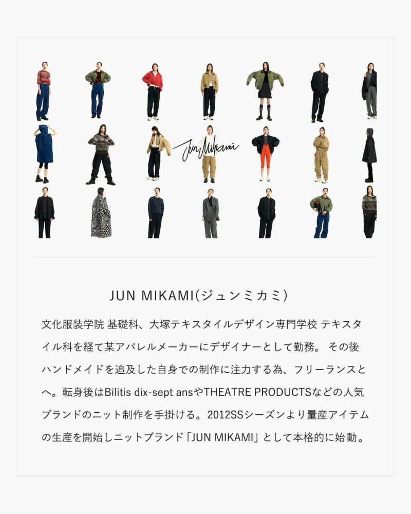 文化服装学院 基礎科、大塚テキスタイルデザイン専門学校 テキスタイル科を経て某アパレルメーカーにデザイナーとして勤務。 その後、ハンドメイドを追及した自身での制作に注力する為、フリーランスとなる。転身後はBilitis dix-sept ansやTHEATRE PRODUCTSなどの人気ブランドのニット制作を手掛ける。 2012SSシーズンより量産アイテムの生産を開始しニットブランド「JUN MIKAMI」として本格的に始動。