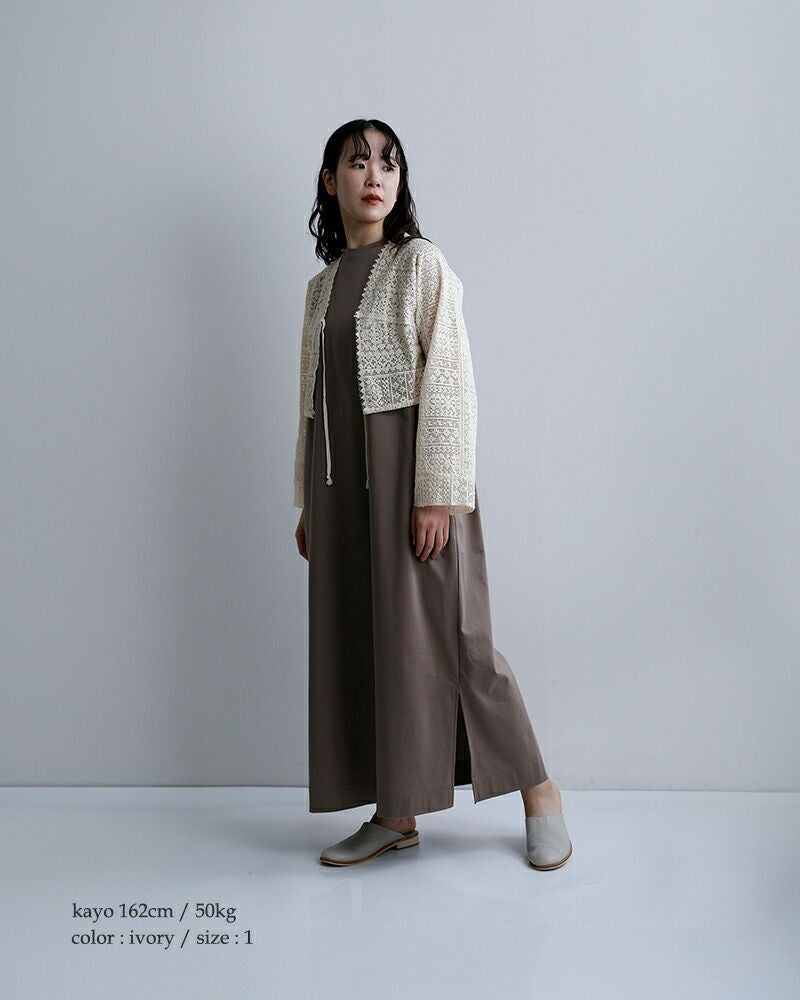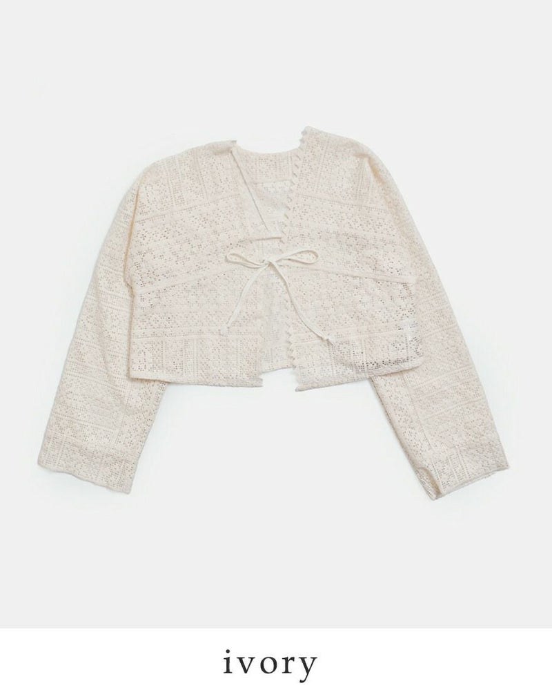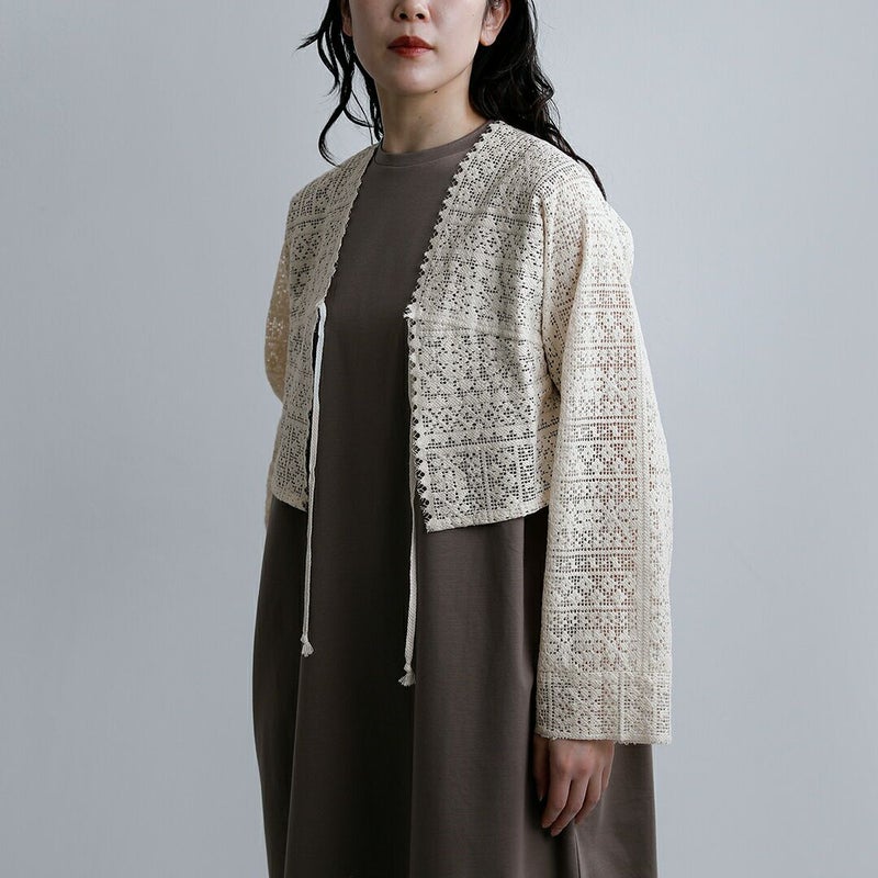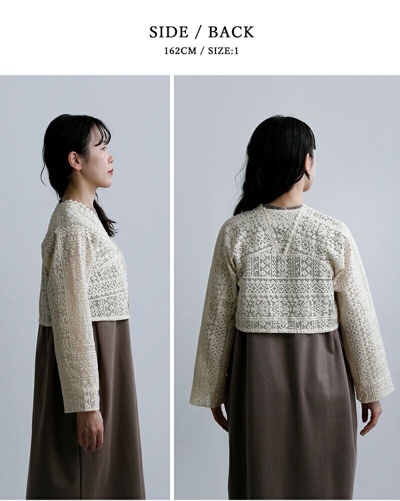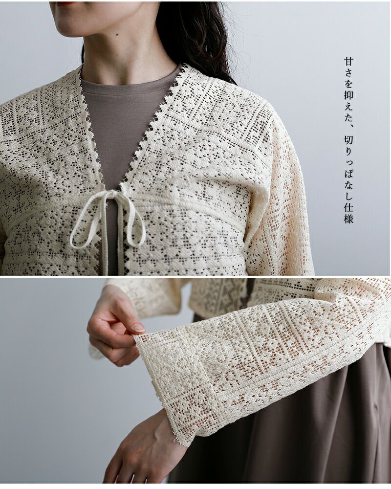 襟元と袖口は切りっぱなしのデザインを採用し、レースの甘さを程よく抑えた仕上がりに。繊細な素材感の中にさりげないラフさを加えることで、ナチュラルながらも大人っぽい印象を演出します。