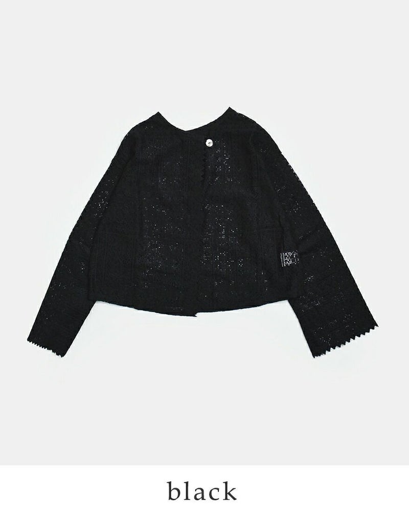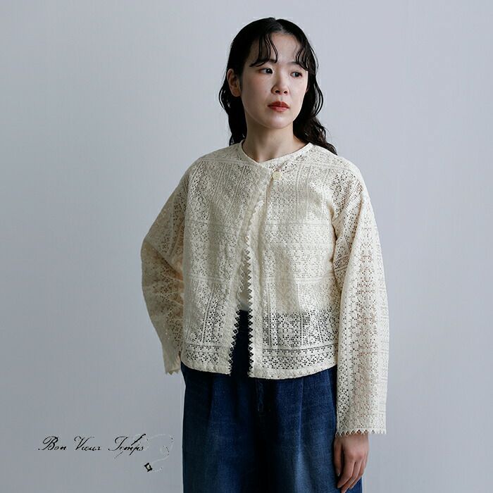 クロスステッチ風の幾何柄のレース素材と切りっぱなしのディテールが特徴。前後を入れ替えて使用できるレースカーディガン 【クーポン対象】bon vieux temps ボンビュータン オーガニックコットン 2way レース シャツ 44433 レディース 2026ss新作 春夏