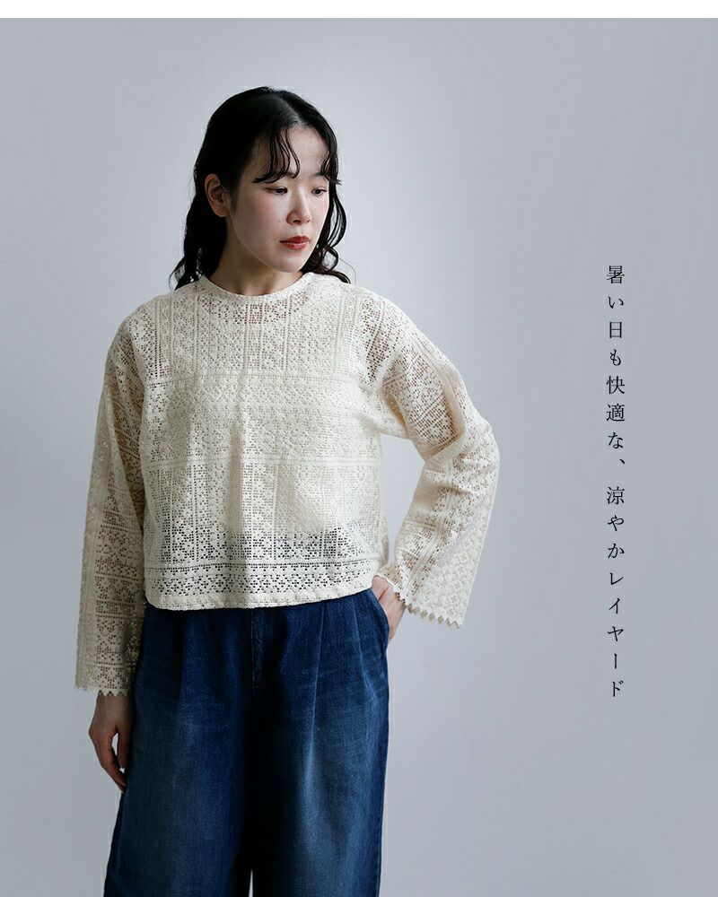 風通しの良い軽やかなレース素材を使用しているため、暑い季節でも涼やかな着心地をキープ。 重ねても重たくならず、夏のレイヤードスタイルを快適に彩る一枚です。