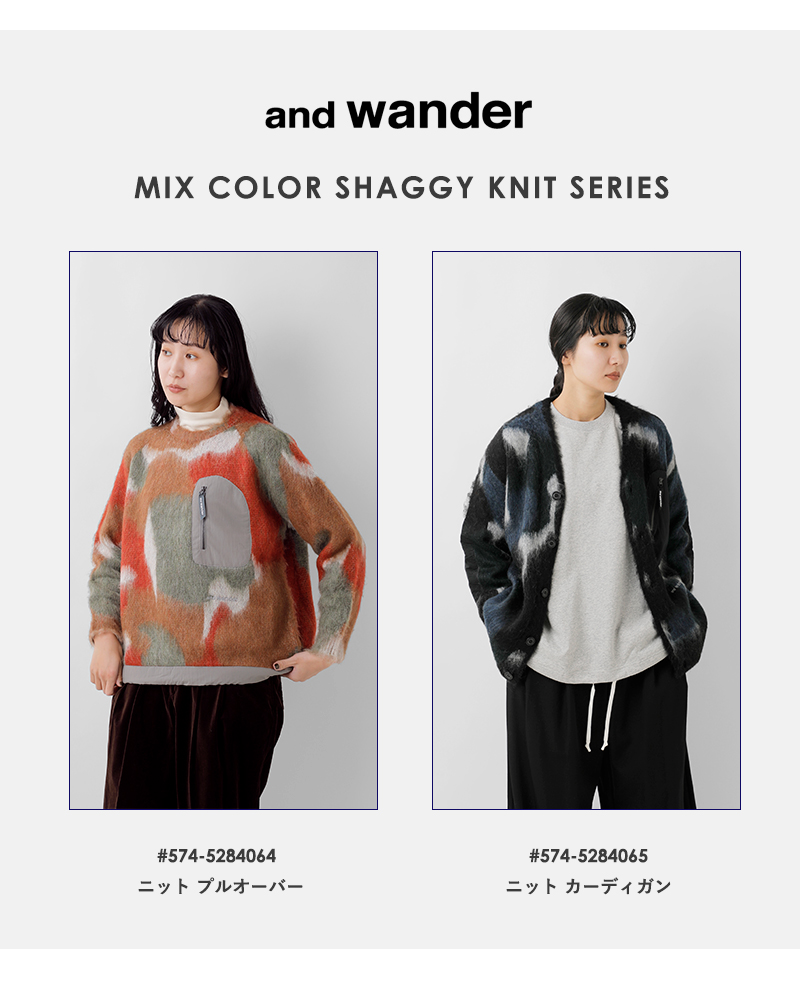 アクリル・ナイロン・ウール・モヘヤをブレンドした糸を、5Gのダブルジャガードで編み立てた贅沢な素材使い。複数の糸が混ざり合うことで、深みのある色合いと立体的な表情を生み出しています。両面に起毛をかけることで、柔らかな風合いと暖かな着心地を実現。毛足のあるシャギー感が、ニット全体に奥行きとボリュームをプラスします。