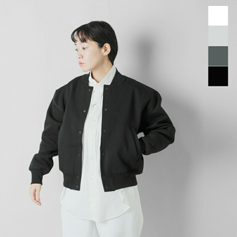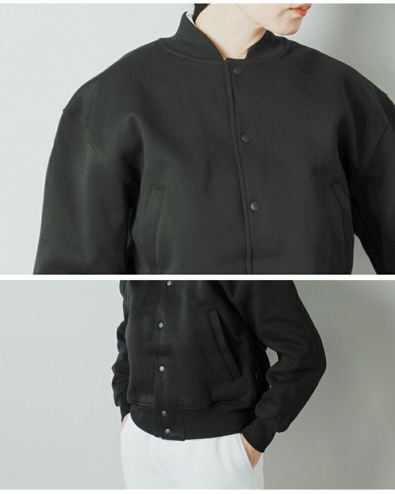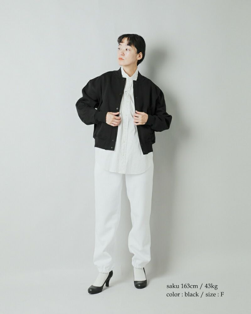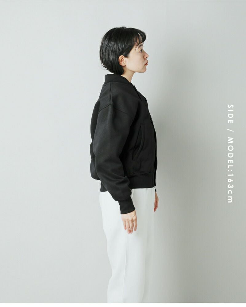 襟はコンパクトなリブ仕様で、スポーティーなデザイン。裾と袖口もリブ生地を使用しています。ベースボールジャケットのようなデザインで、都会的でスポーティーな雰囲気が魅力。