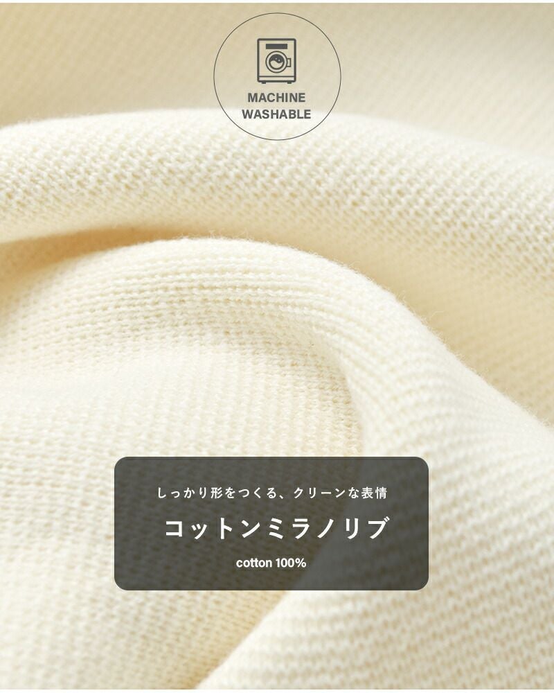 きれいめで上品な雰囲気のミラノリブを使用。綿100%の柔らかい生地感で肌触りが良く、直接肌に触れてもさらりと着心地良くご着用頂けます。程よく肉厚でしっかり目の詰まったニットは、上品な雰囲気でオフィスカジュアルにも活躍します。肉厚のしっかりとした生地なのでシルエットが崩れにくくきちんと感も◎。マシンウォッシャブル可能でお手入れもラクチンです。
