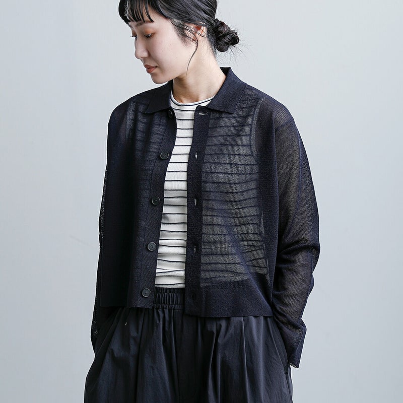 袖口や裾はリブで整えられ、全体のシルエットを美しく保ちます。軽やかな素材の透け感がさりげなく表情を添えています。