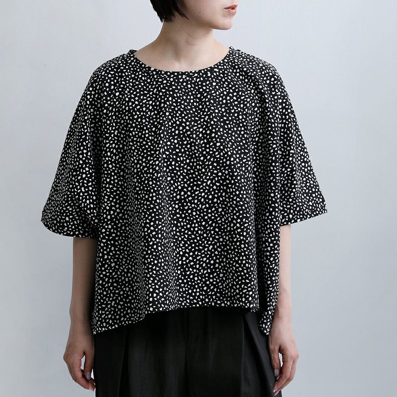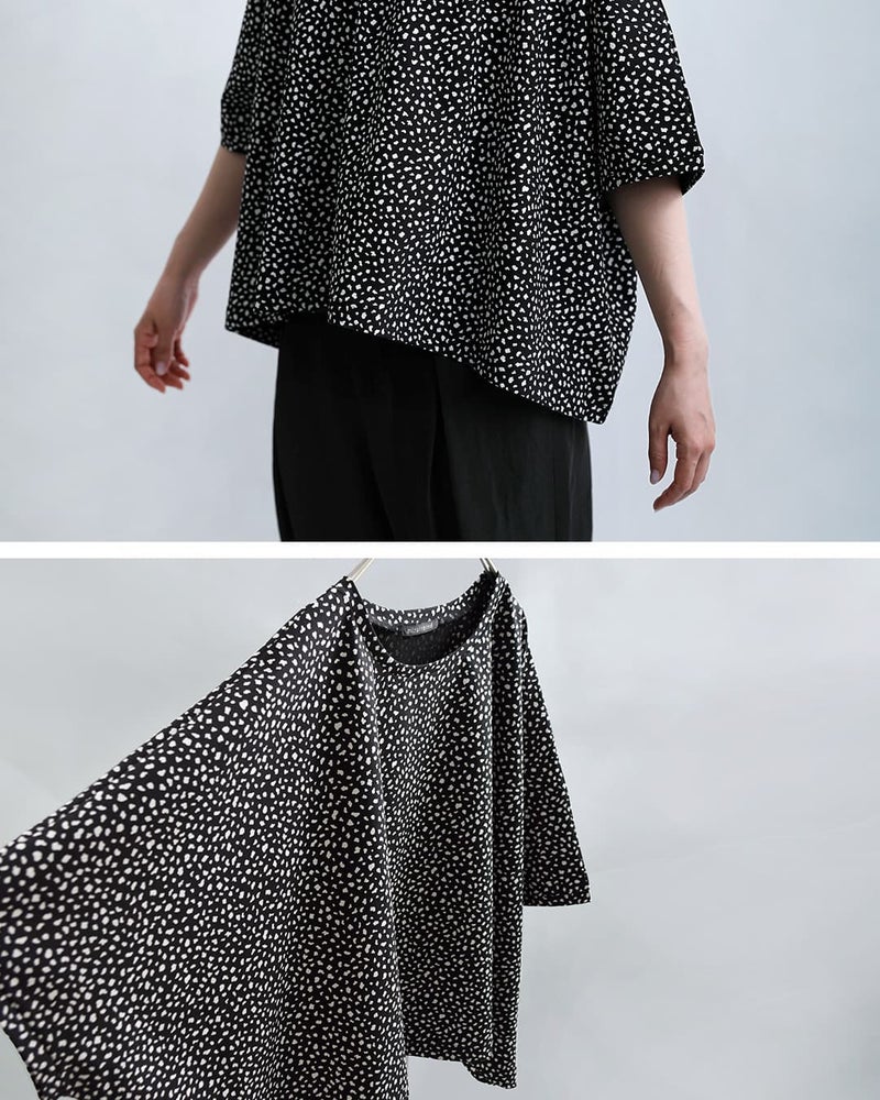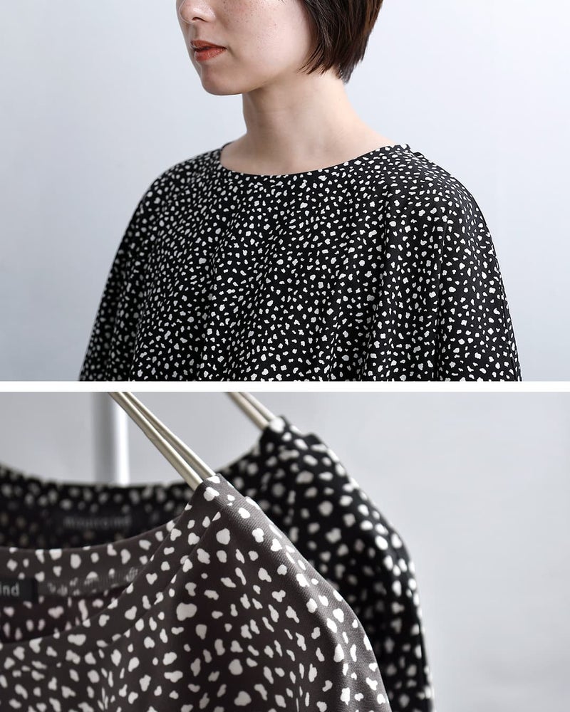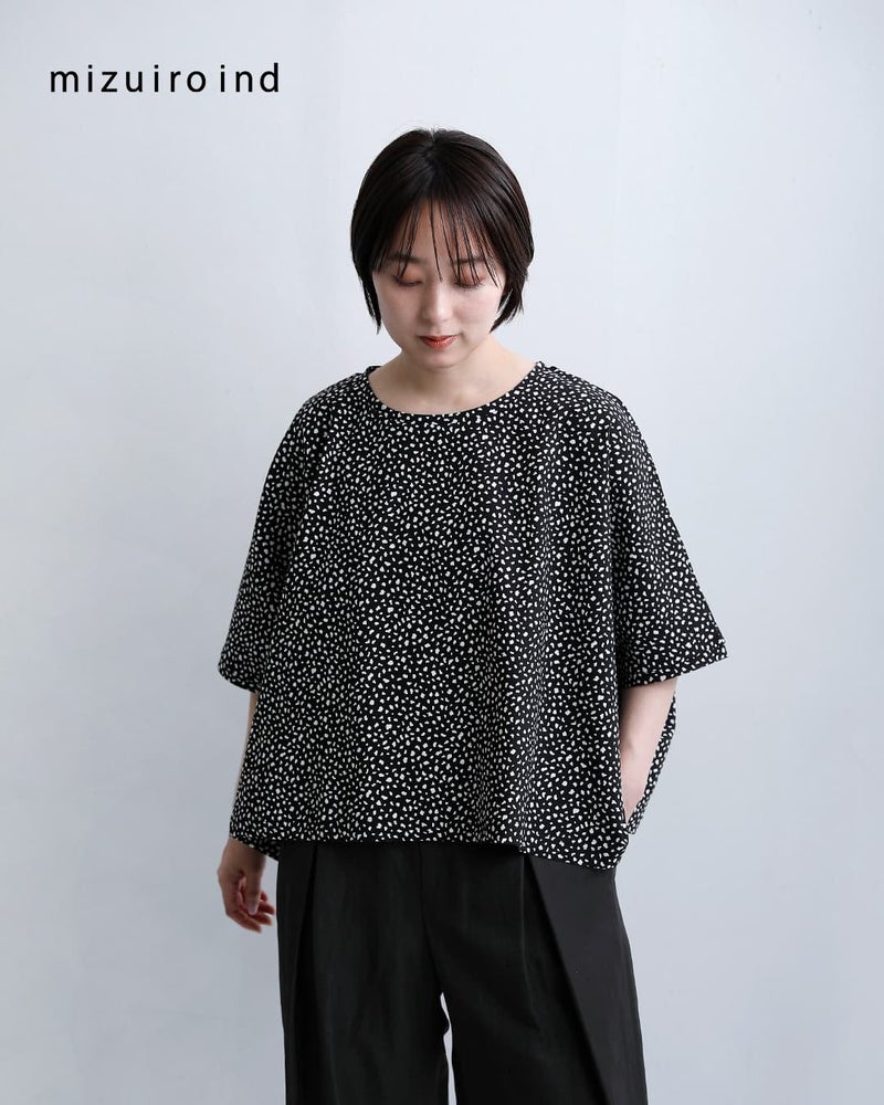 mizuiro ind(ミズイロインド)より、プリントワイドプルオーバーのご紹介です。モノトーンで洗練された印象に仕上げた、mizuiro indのオリジナルプリントワイドプルオーバー。ヒョウ柄をベースにしながらも落ち着いたカラーリングにすることで、アニマル柄特有の強さを抑え、日常に取り入れやすい一枚に仕上げました。軽やかな着心地ときれいなフォルムを両立した、大人のための柄トップスです。