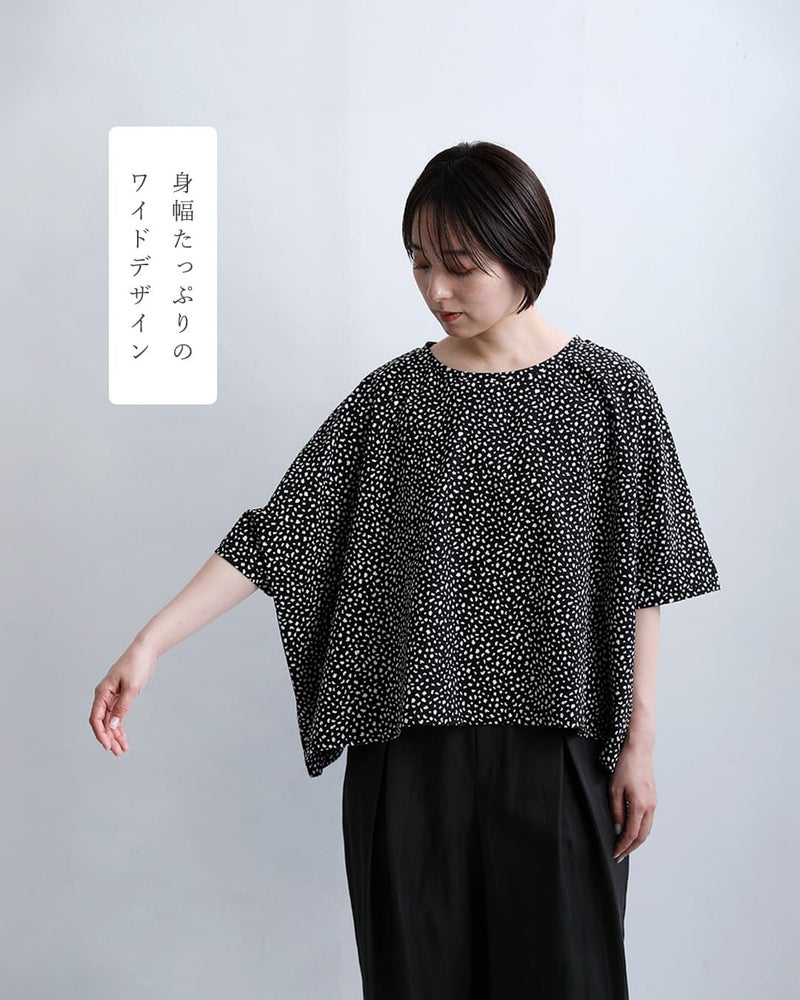 肘にかかる袖丈で気になる二の腕を自然にカバーし、リラックス感のあるバランスに仕上げています。サイドに落ちるようなシルエットが動きを生み、シンプルながらも存在感のあるデザイン。