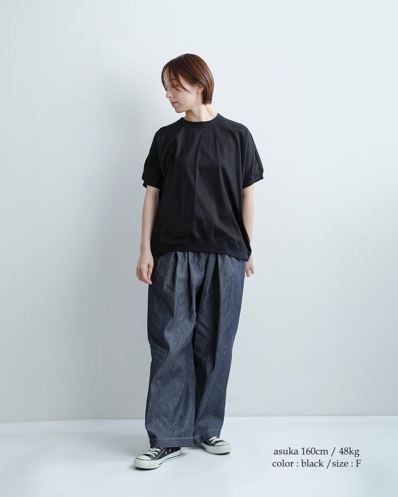 やや詰まったリブ仕様のクルーネックでメンズライクな雰囲気。耐久性の高いバインダーネックだから首周りが伸びにくく、デイリーにガンガン使えます。