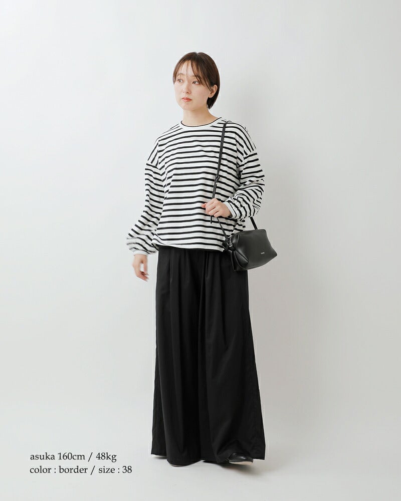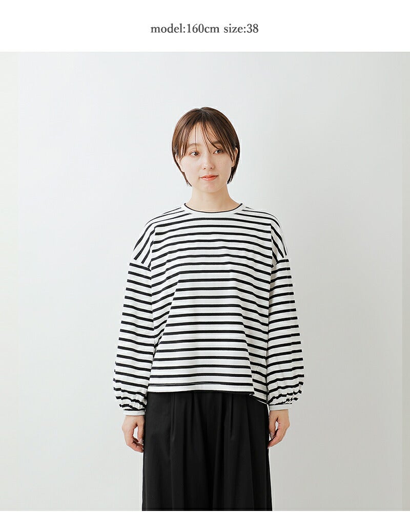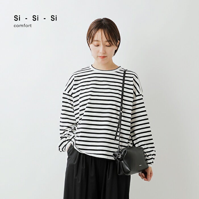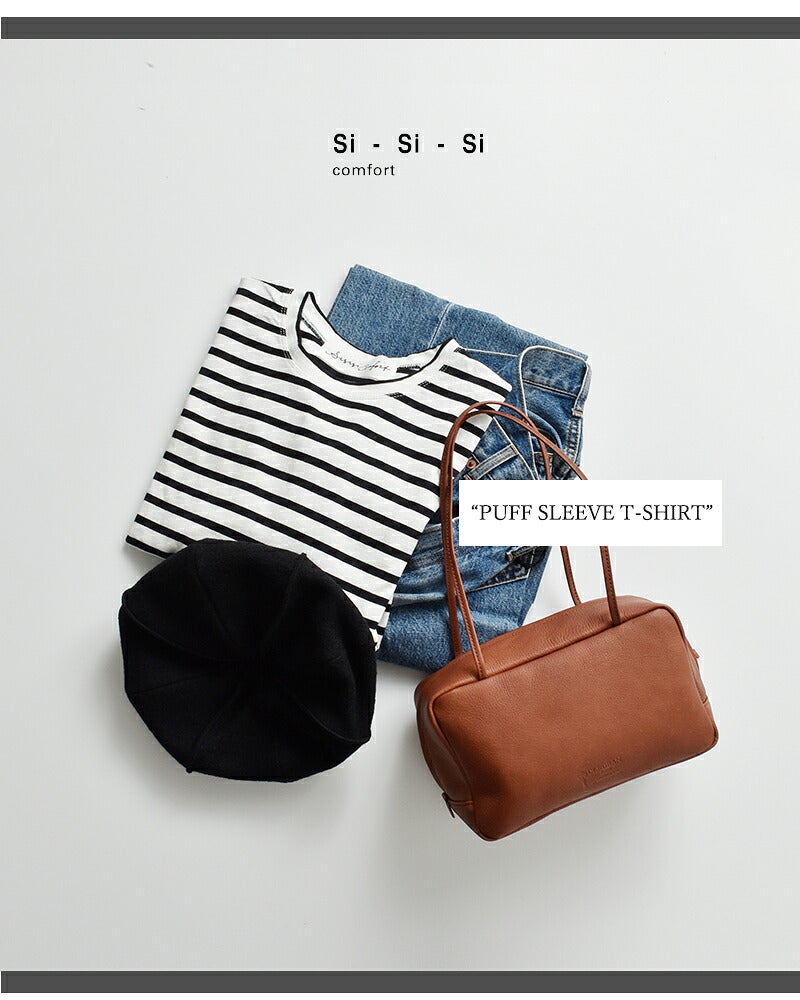 Si-Si-Si(スースースー)より、コットン ボーダー パフ スリーブ Tシャツをご紹介します。シンプルなボーダーカットソーをパフスリーブに仕上げた、可愛らしいロングスリーブTシャツです。ふんわりとしたお袖がアクセントになり、1枚で着ても映えるアイテムです。ドロップショルダーの程よくゆとりのあるシルエットで、普段使いにぴったり。コットン100%の柔らかな生地で、長いシーズンお使いいただけます。