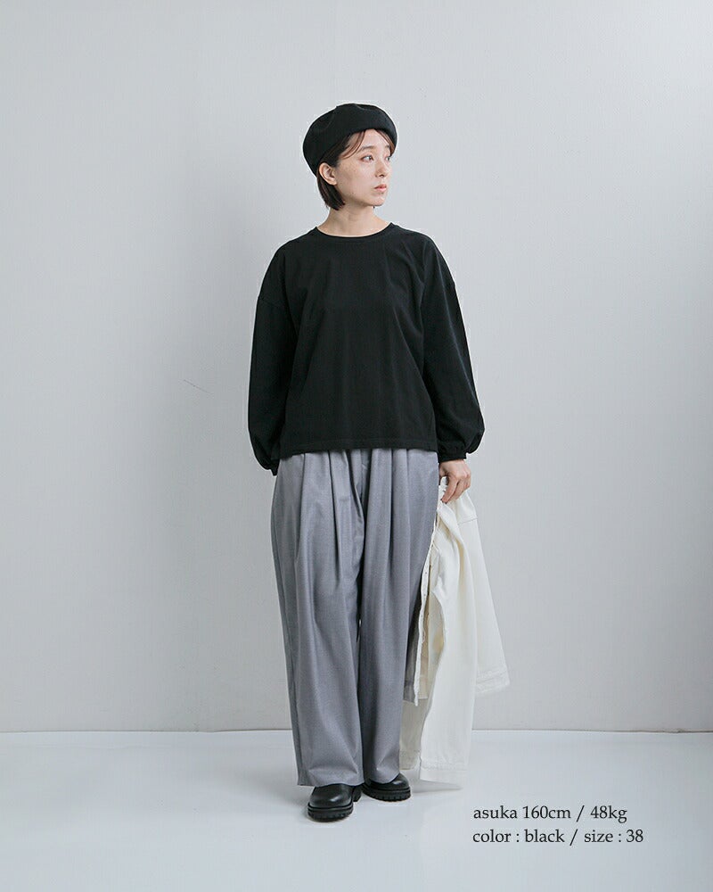 ふんわりとしたパフスリーブが可愛らしいディティール。サイドの切り替えを斜めのラインで少しシェイプさせているので、裾アウトで着た時も、すっきりとした見映えになります。