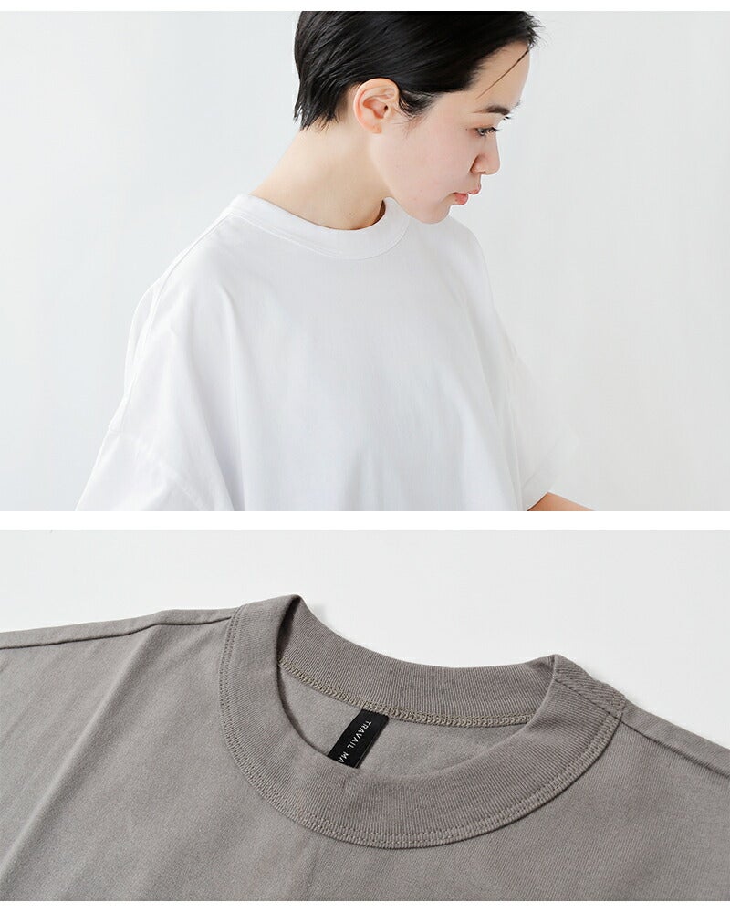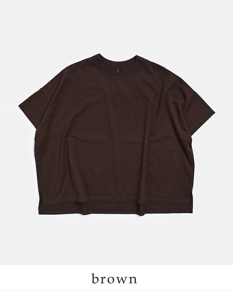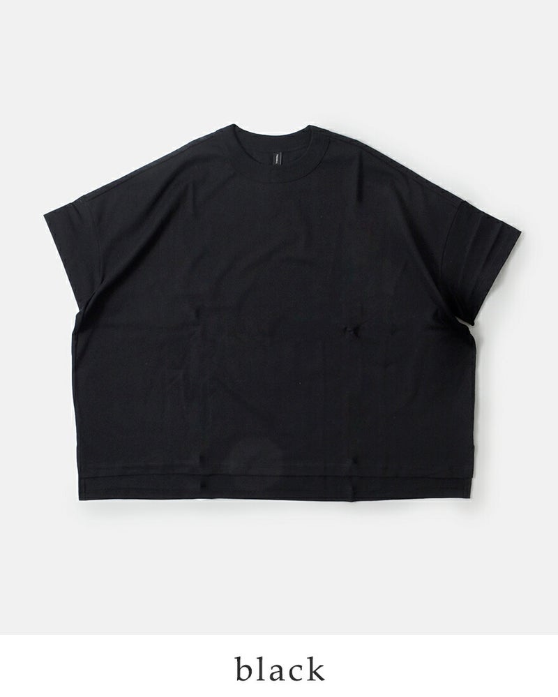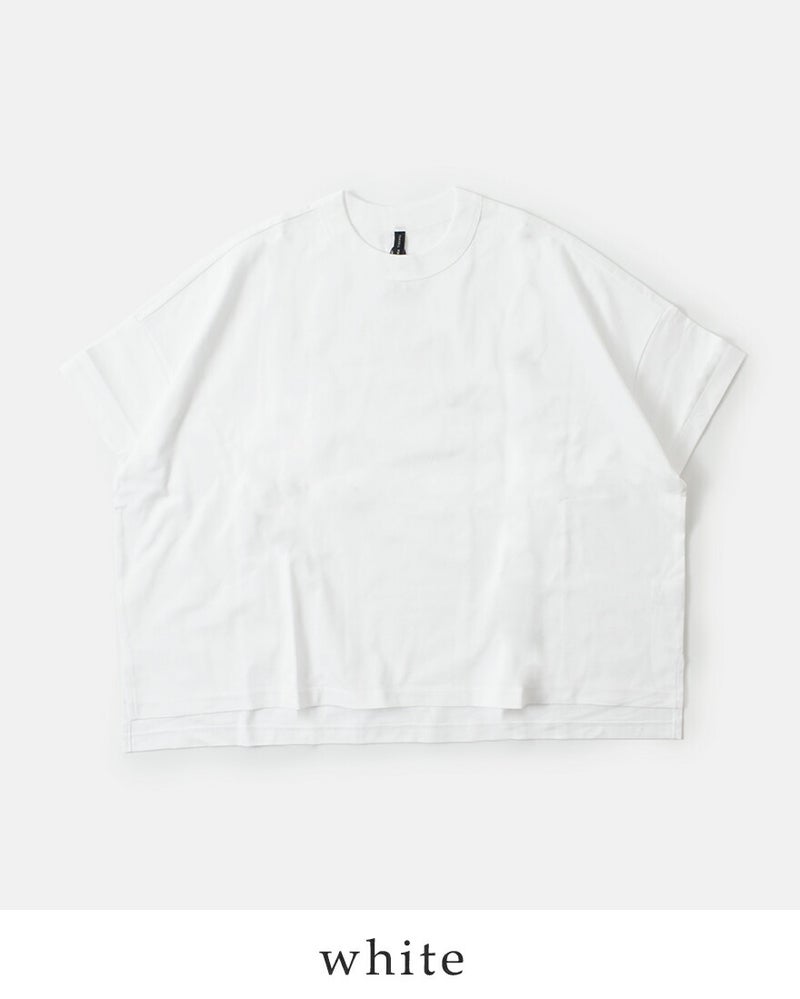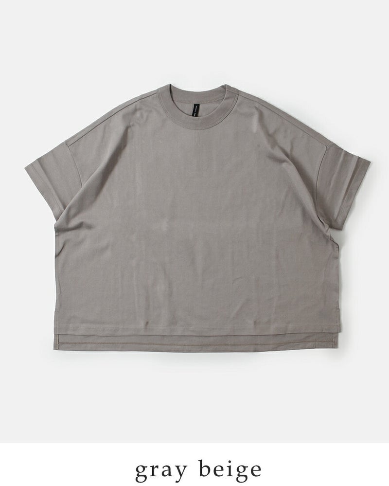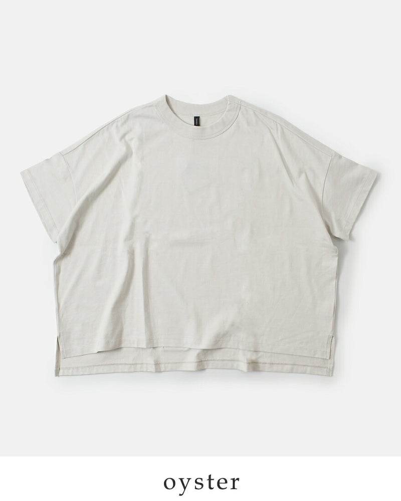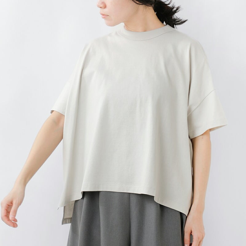 ワイドなシルエットと対照的なやや詰まった襟ぐりは、しっかりとしたリブ仕立てとなっており高伸縮性に。屈んだ時に襟ぐりが気にならず、安心感のある着心地です。