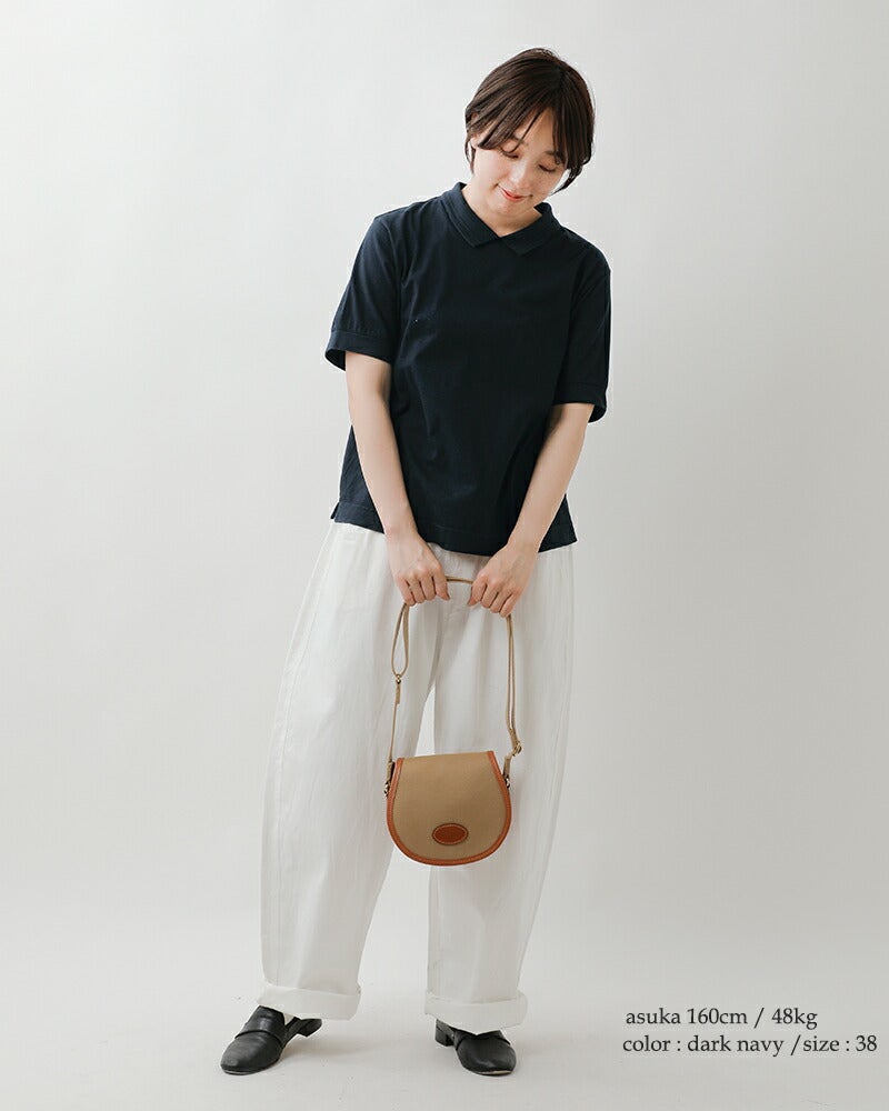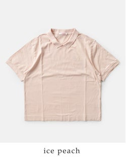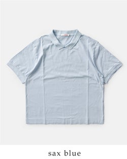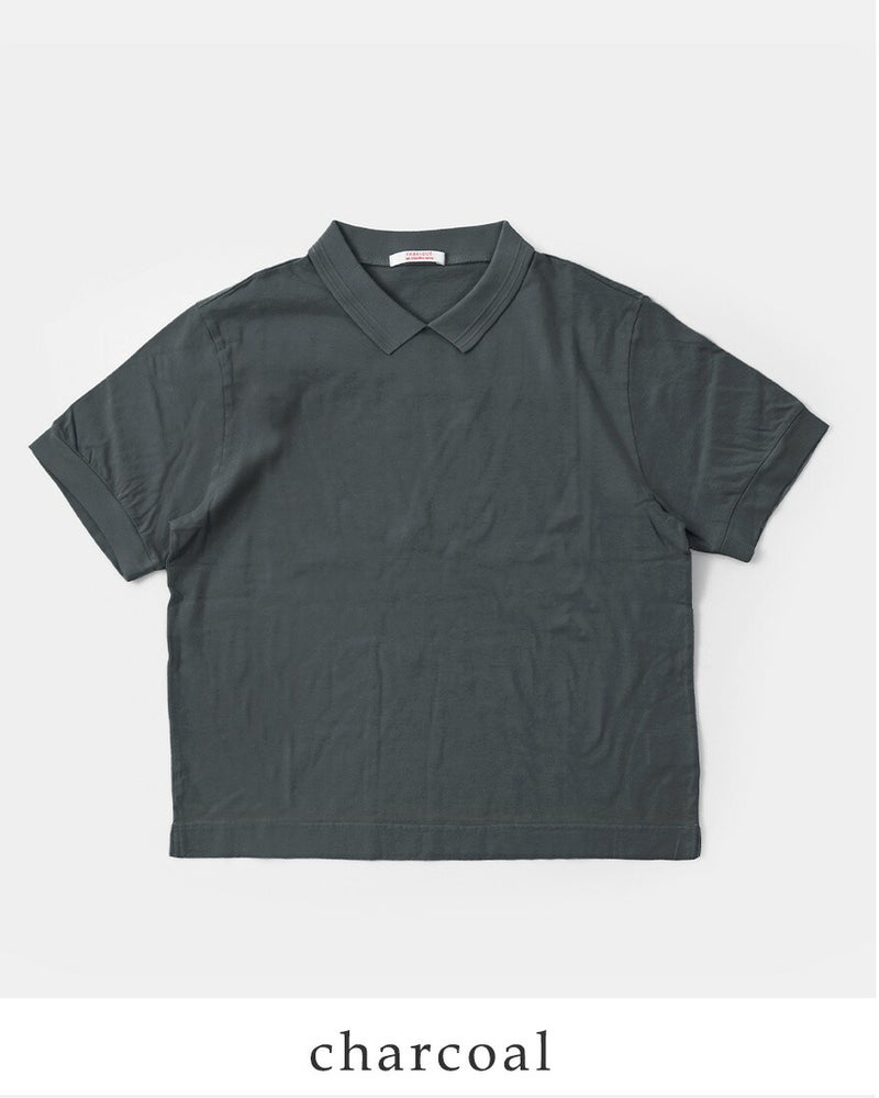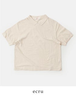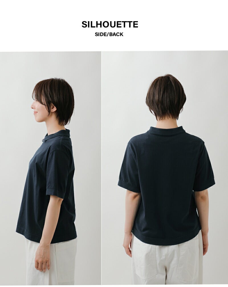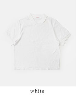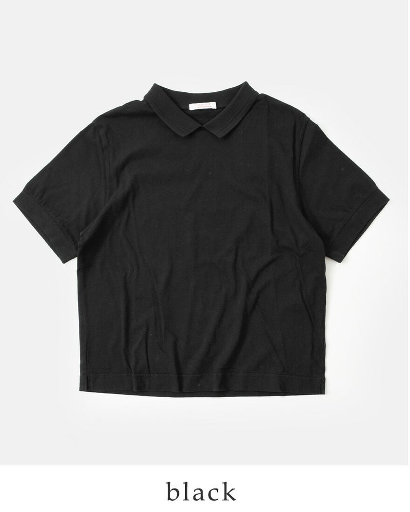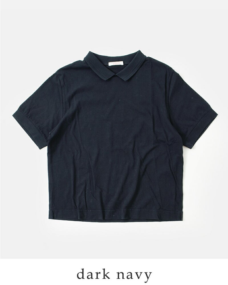 リブ編みで変化をつけた小さめの襟がついたポロデザインがポイントに。カジュアルなTシャツにほんのりきちんと感を添えます。また、襟裏のネームはコットンの肌のデリケートな方にもやさしいタッチのものをつけています。