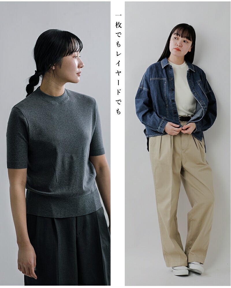 1枚で着てもサマになる秀逸なバランスでカジュアルな装いにも、キレイ目の装いにも活躍するアイテムです。日中は長袖だと暑く、半袖では朝晩は寒い、気温が安定しない春から夏にかけての季節に大活躍する5分袖ニットそーは大変便利なアイテムです♪