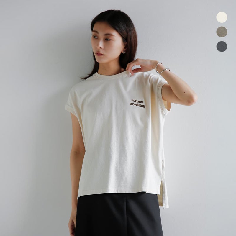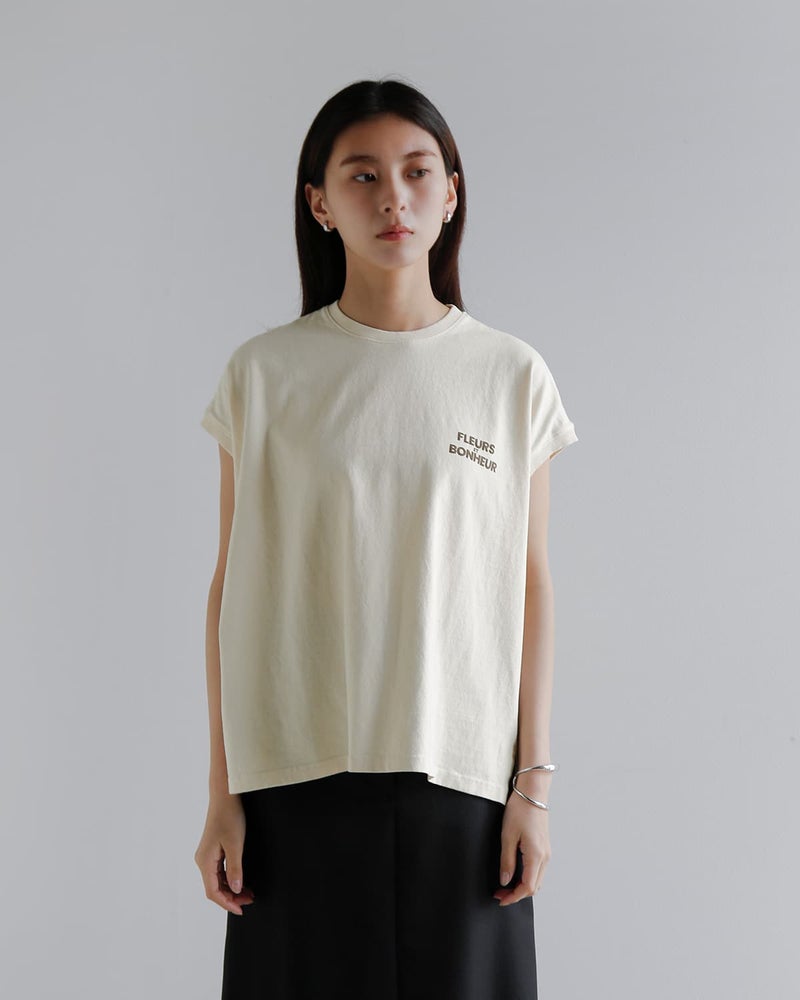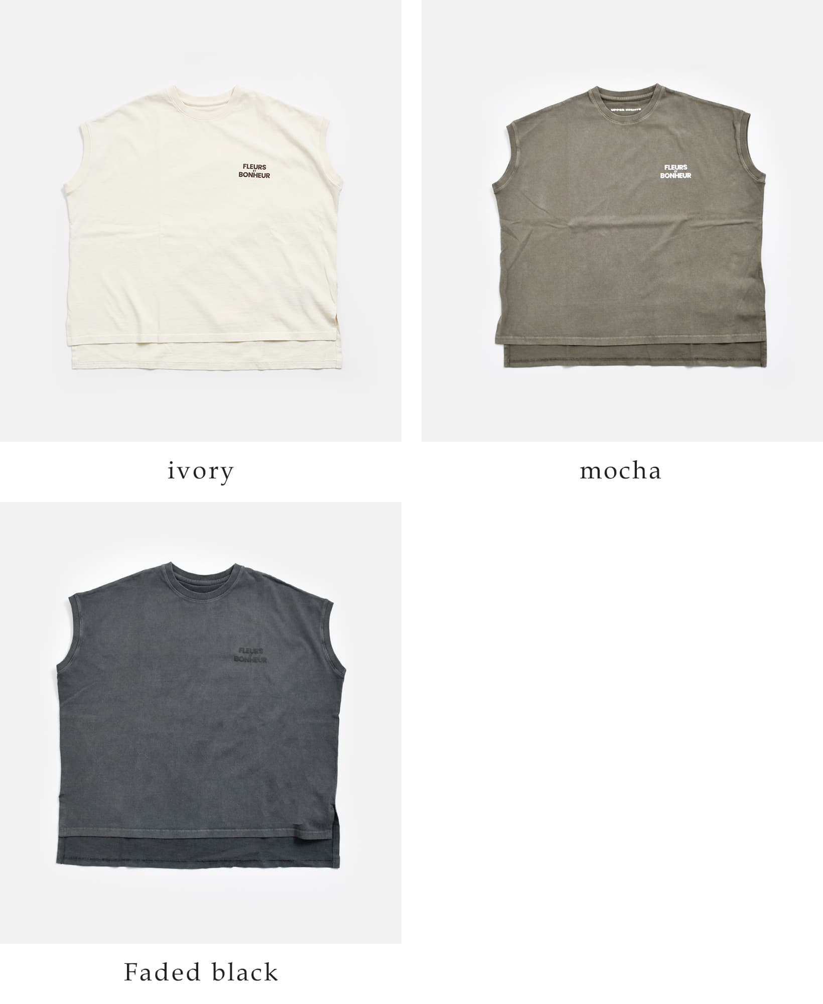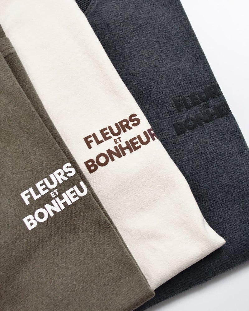 フロントには「FLEURS ET BONHEUR(花と幸福の意)」のロゴを配し、シンプルな中にさりげないアクセントをプラスしています。肉厚な太番手天竺を使用し、さらに硫化染料による製品染めを施すことで、素材そのものの表情を引き立てた仕上がりに。
