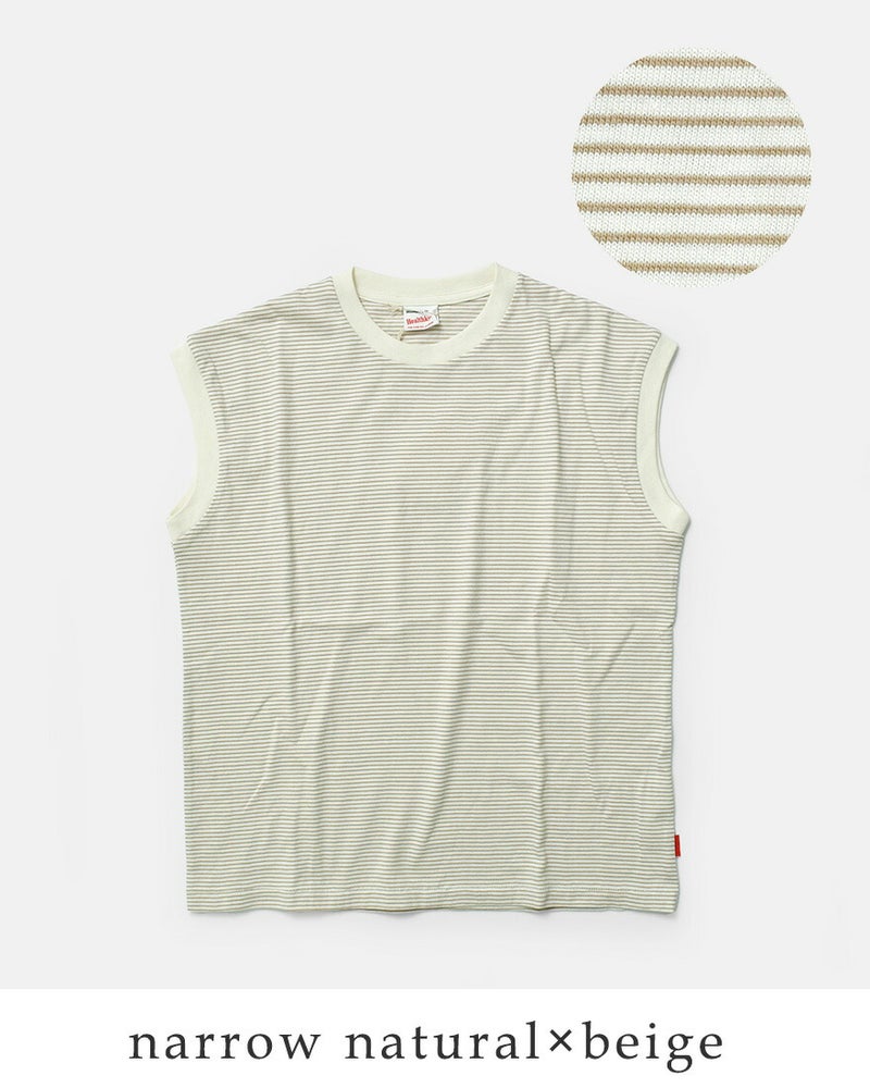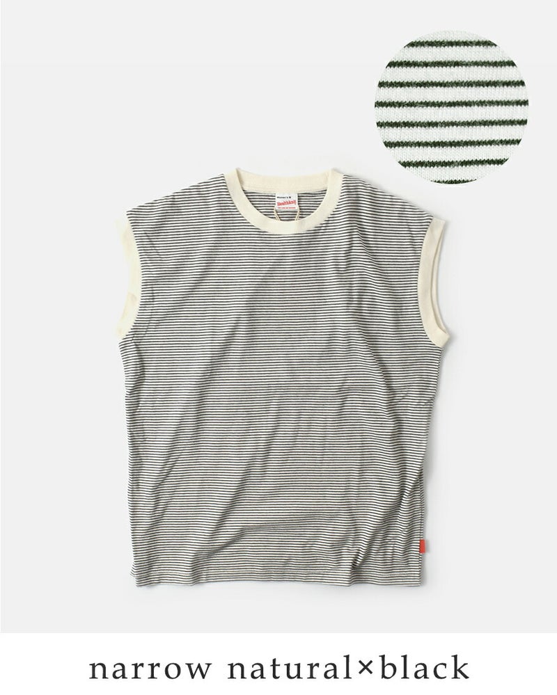 Healthknit(ヘルスニット)よりコットンナローボーダージャージークルーネックスリーブレスプルオーバーのご紹介です。柔らかく肌触りの良いU.S.コットンを使用し、90年代の少しレトロな空気を感じるようなボーダー柄。厚すぎず薄すぎない、ちょうど良いウェイトの素材感です。タックインでもアウトでもすっきりと見える短めの着丈。袖は肩を覆うフレンチスリーブで二の腕まわりをすっきり見せてくれます。抗菌防臭加工を施すことで汗ばむ季節でも安心して着用でき、デイリーウェアとして最適な仕上がりです。