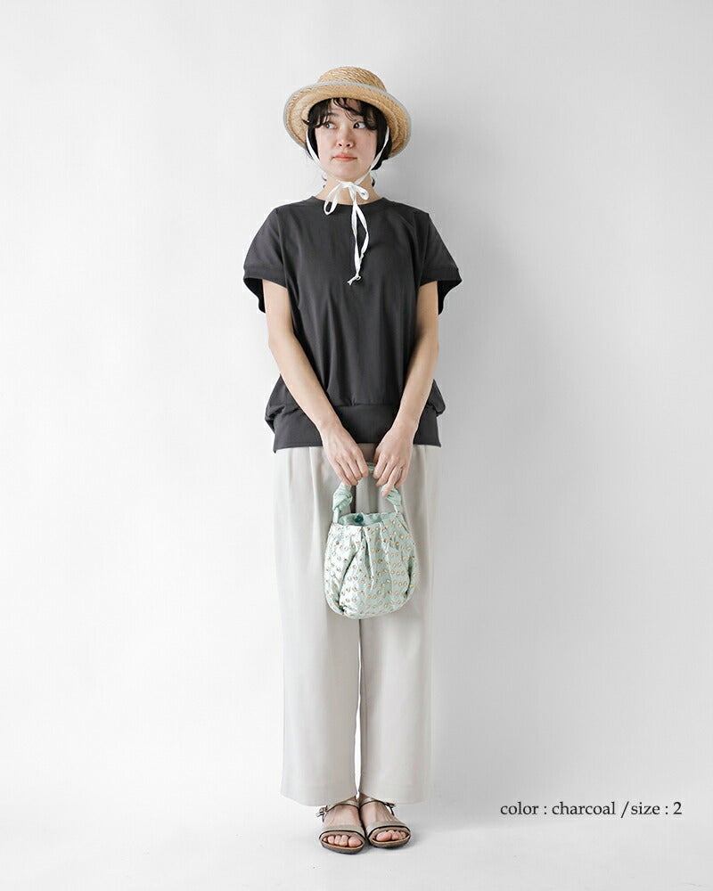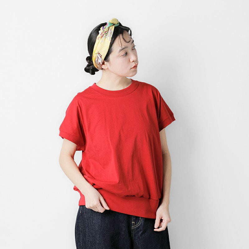 コンパクトでベーシックなクルーネック。長めのフレンチスリーブはゆったりと幅もあり、二の腕もカバーして華奢見えするデザイン。
