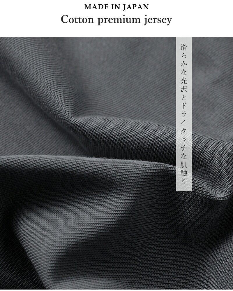 薄手のコットンプレミアム天竺素材を使用しています。奥行きを生み出す霜降りな色合いも素敵。USAコットンのような着心地の良いドライタッチながら、滑らかに肌に乗る生地感。ほのかなハリ・ツヤが上品で高級感のある着こなしを演出します。