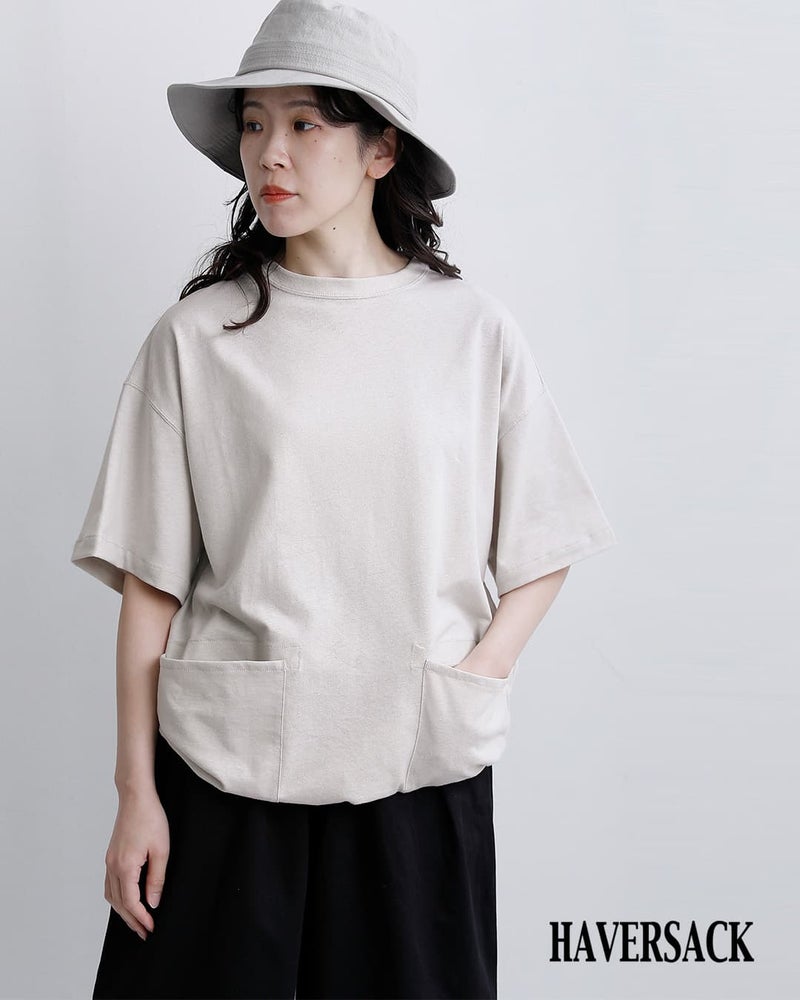 HAVERSACK(ハバーサック)よりコットンヘンプ天竺ルーズフィット Tシャツのご紹介です。コットンヘンプ素材のドライな質感を活かした、裾のシャーリングが目を惹くルーズフィットTシャツ。フロントポケットやヘリンボーンテープなど、ワークのディテールを散りばめた立体的なフォルムが、一枚で主役級の存在感を放ちます。身体を優しく包み込むリラックスしたシルエットと、清涼感のある肌触りで、夏の日常を快適かつスタイリッシュに彩る一着です。