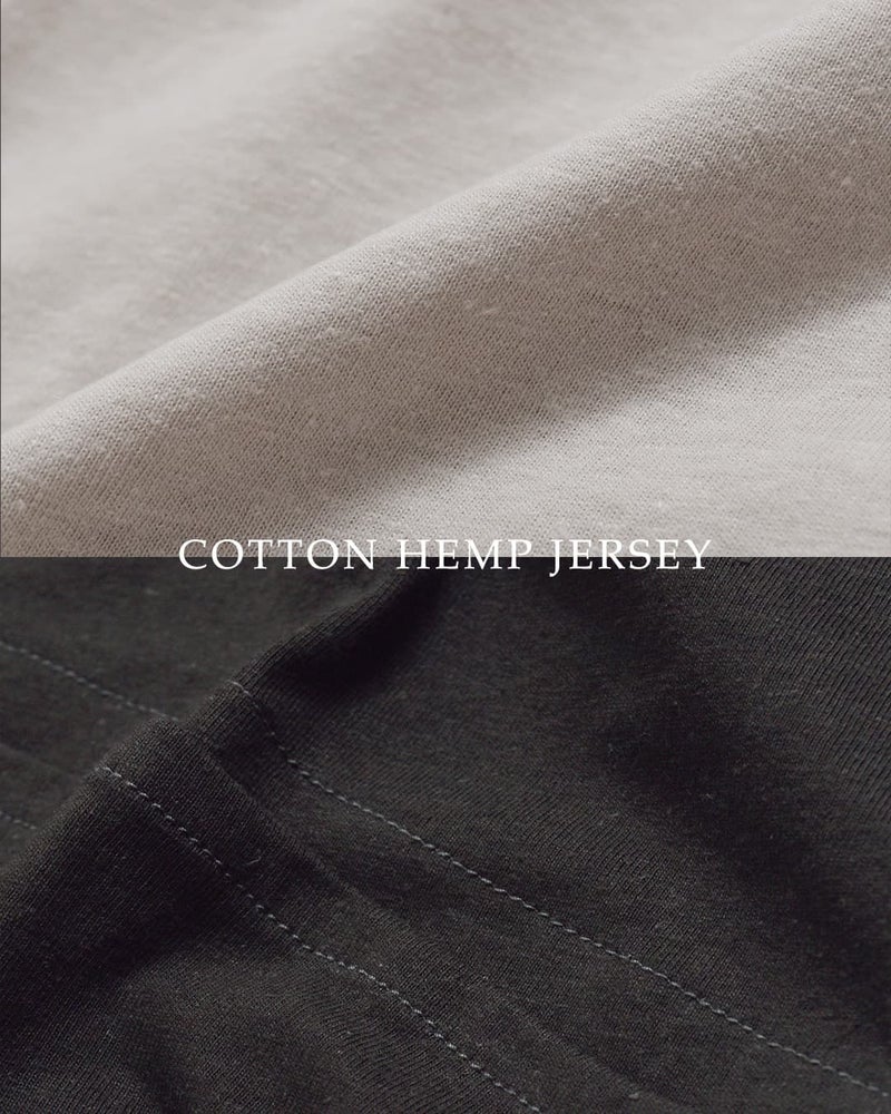 コットンにヘンプ(麻)を混紡した天竺素材を採用。コットンの柔らかな肌触りに、ヘンプ特有のシャリ感と清涼感、そして適度なハリが加わり、汗ばむ季節でも肌離れ良く快適に過ごせます。着込むほどに増していく、ナチュラルで表情豊かな風合いが魅力です。