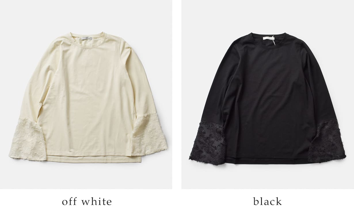カットソー生地と、袖口にシアー感のあるカットジャガードを組み合わせた華やかなトップスです。Tシャツライクなプルオーバーですが、ブラウスのような上品な着こなしを楽しめます。ニットやスウェットのインに着て、カフスを袖から見せるのもおすすめ。おでかけにも使えて、1枚で様になるリュクスなデザインカットソーです。