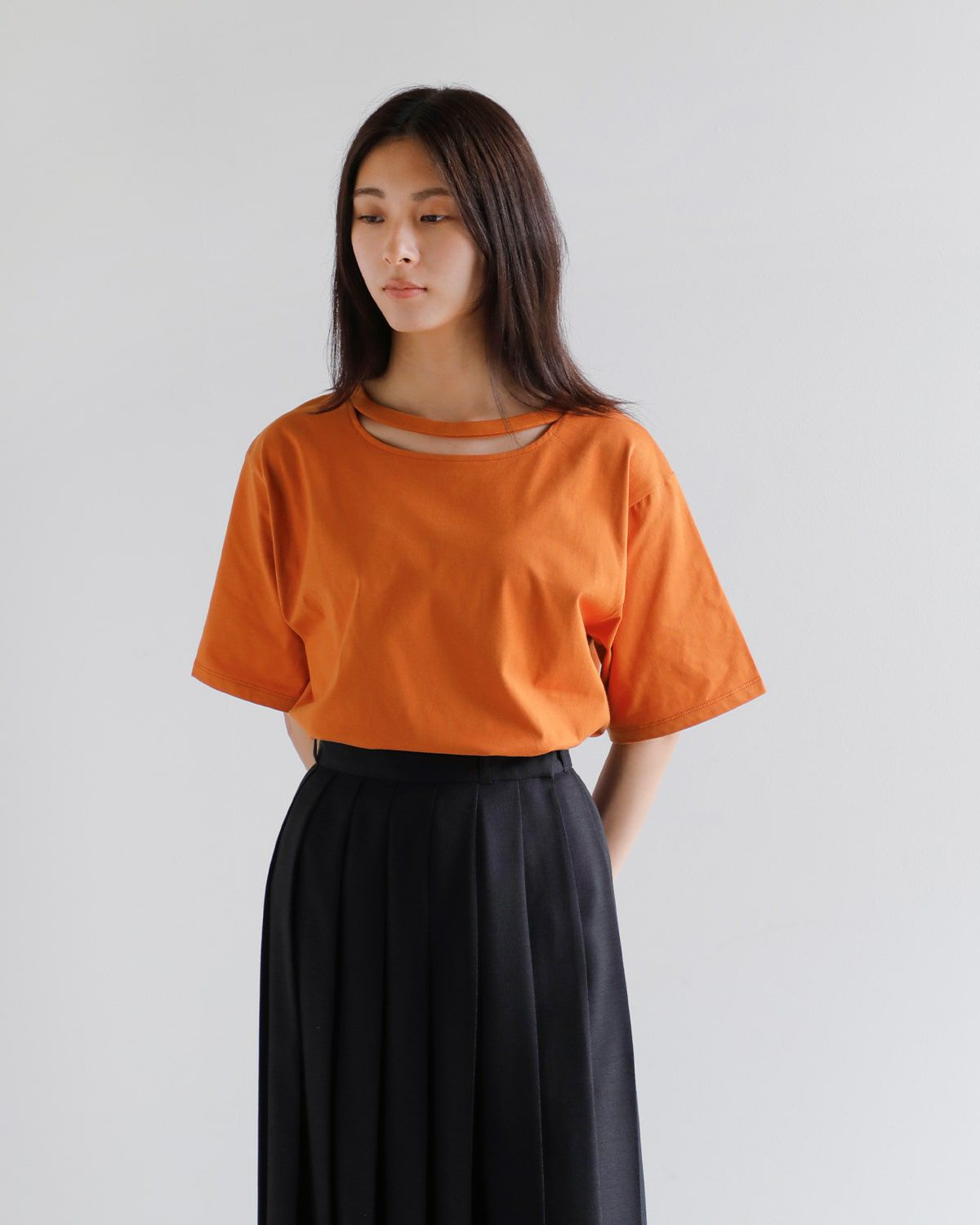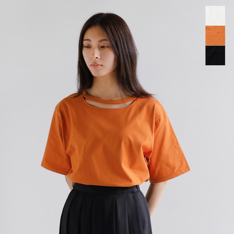 三日月型のスリットが施されたネックライン。程よい肌見せで抜け感を演出。